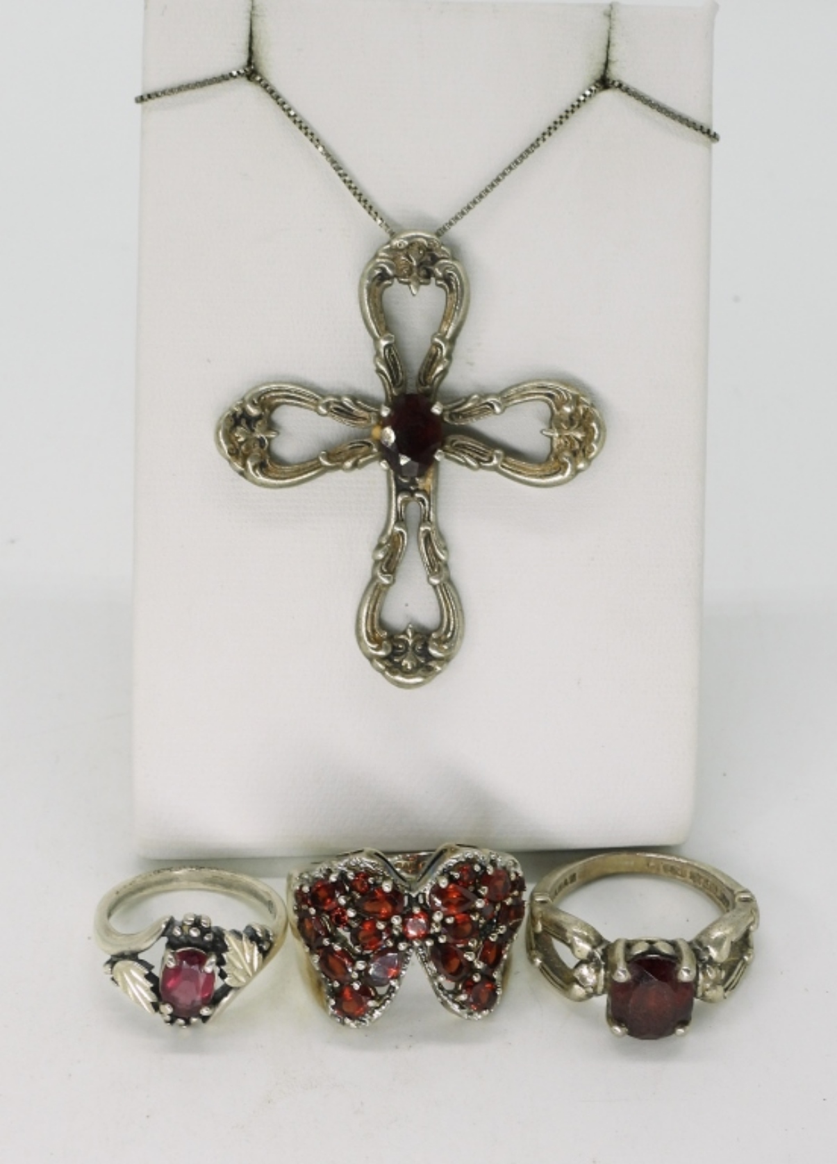 Three sterling rings with garnet gemstones, sizes 6, 7, 8. Sterling cross pendant, 2″ long with a center garnet gemstone, on a 20″ chain. (17 dwt)