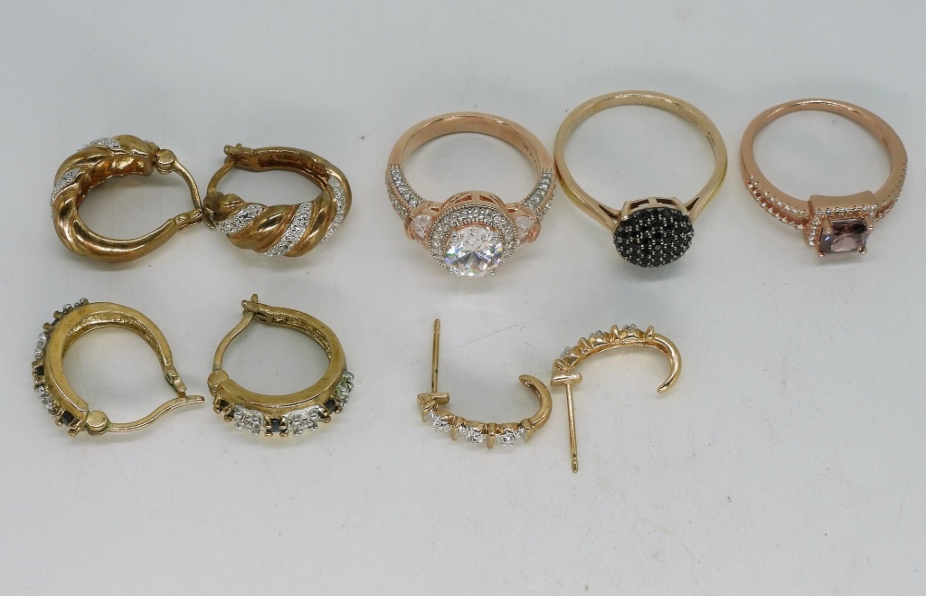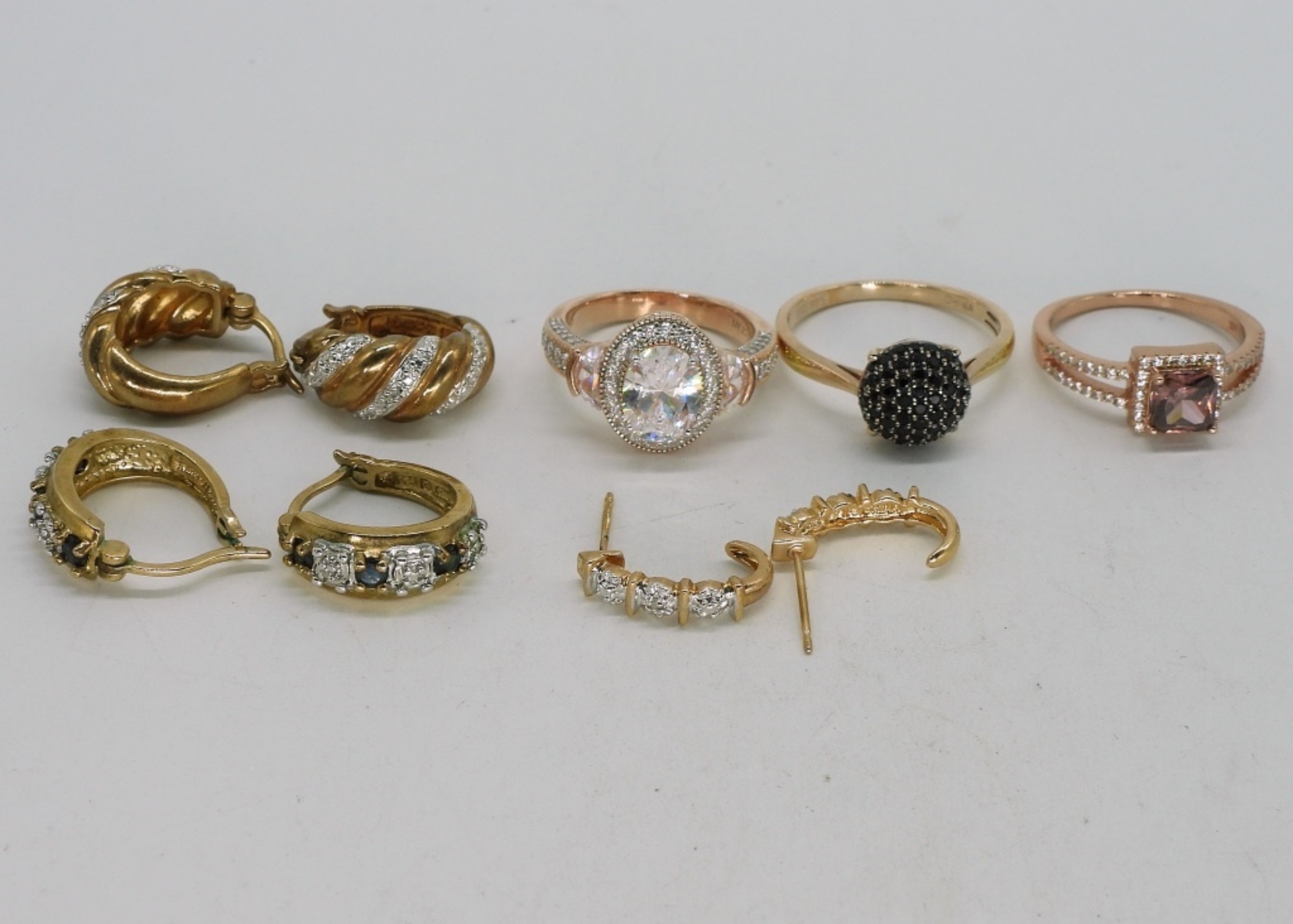 Three sterling gold tone rings, sizes 7, 8, 10. Three pair of sterling gold tone pierced earrings. (14 dwt)