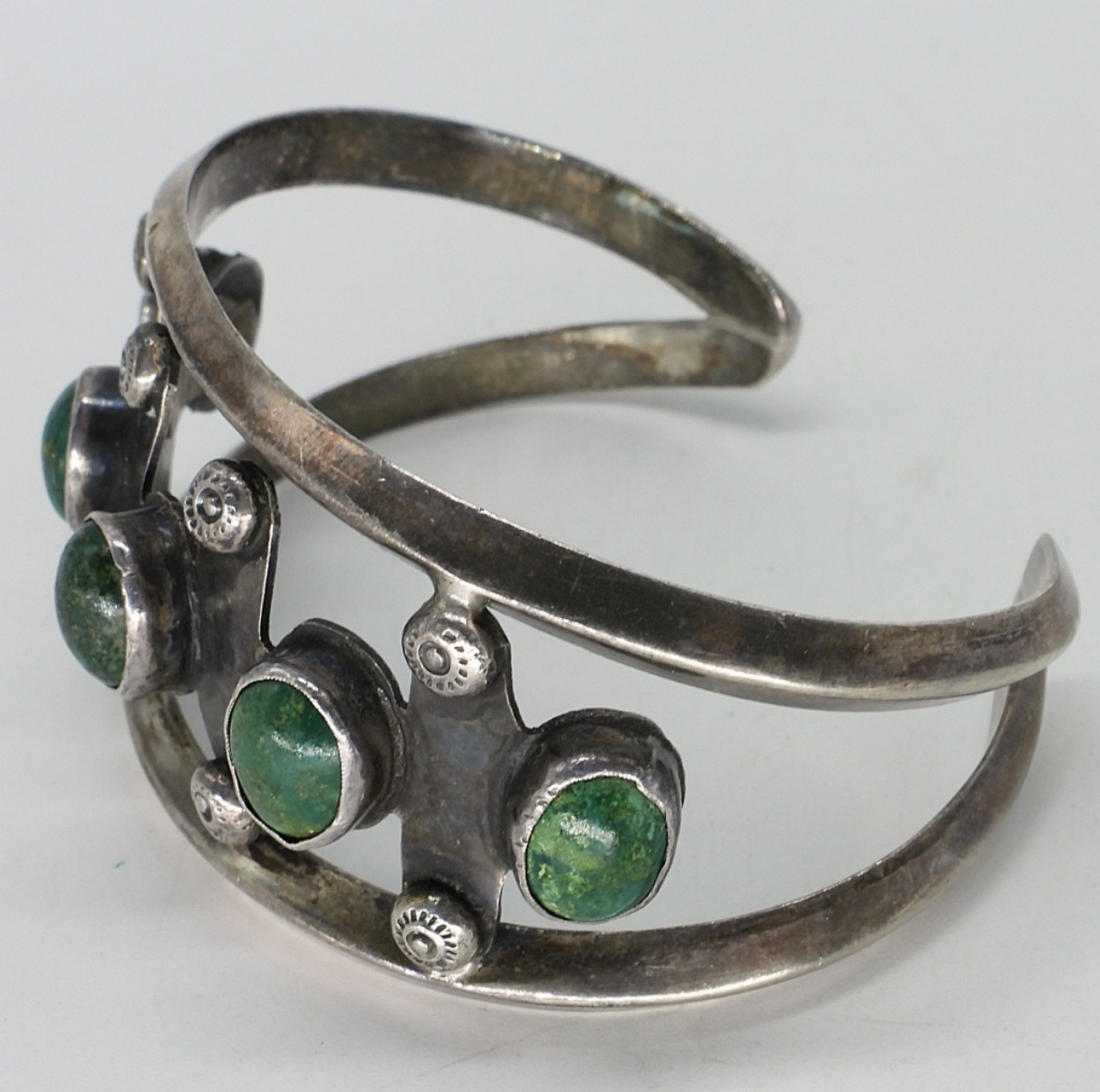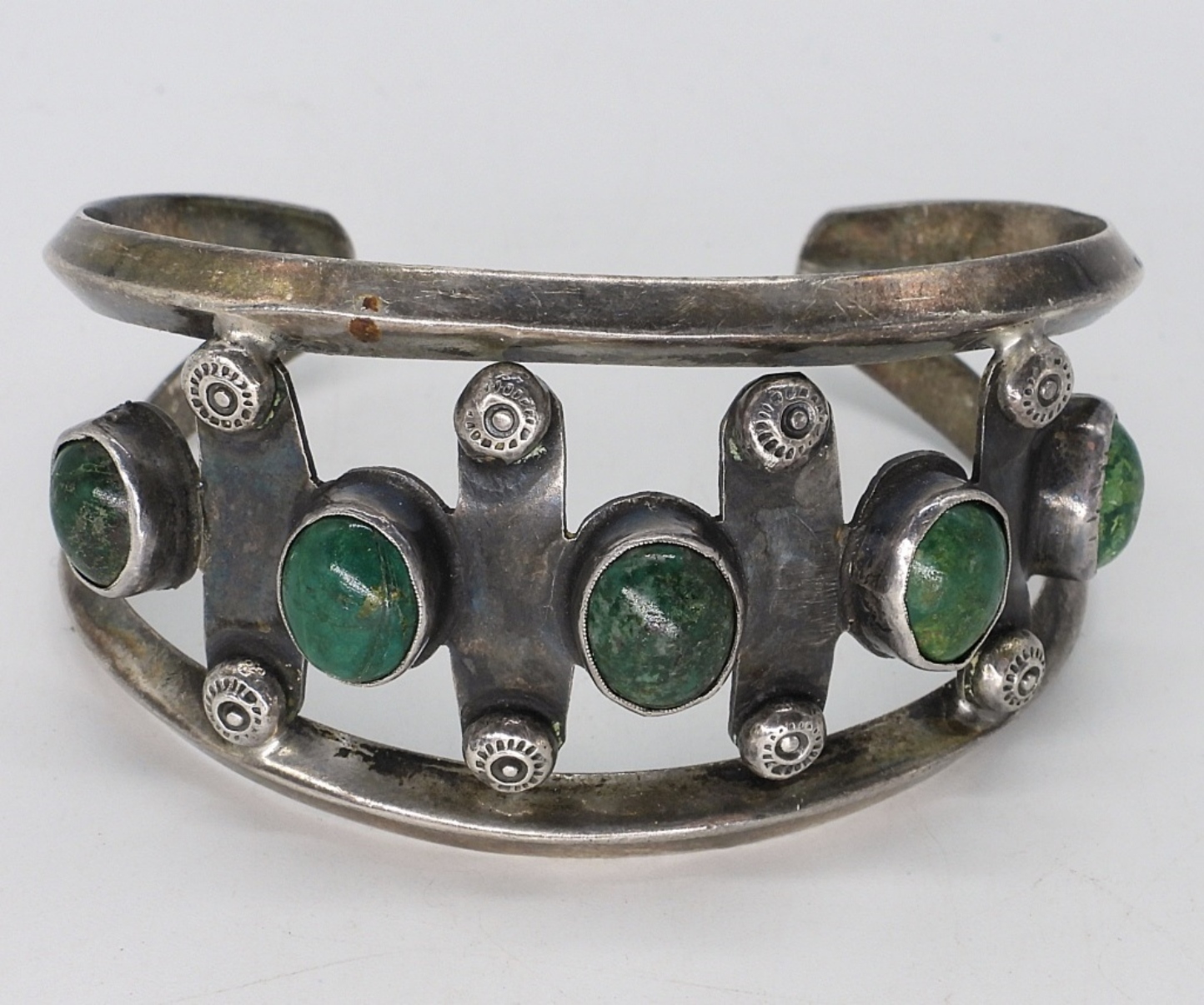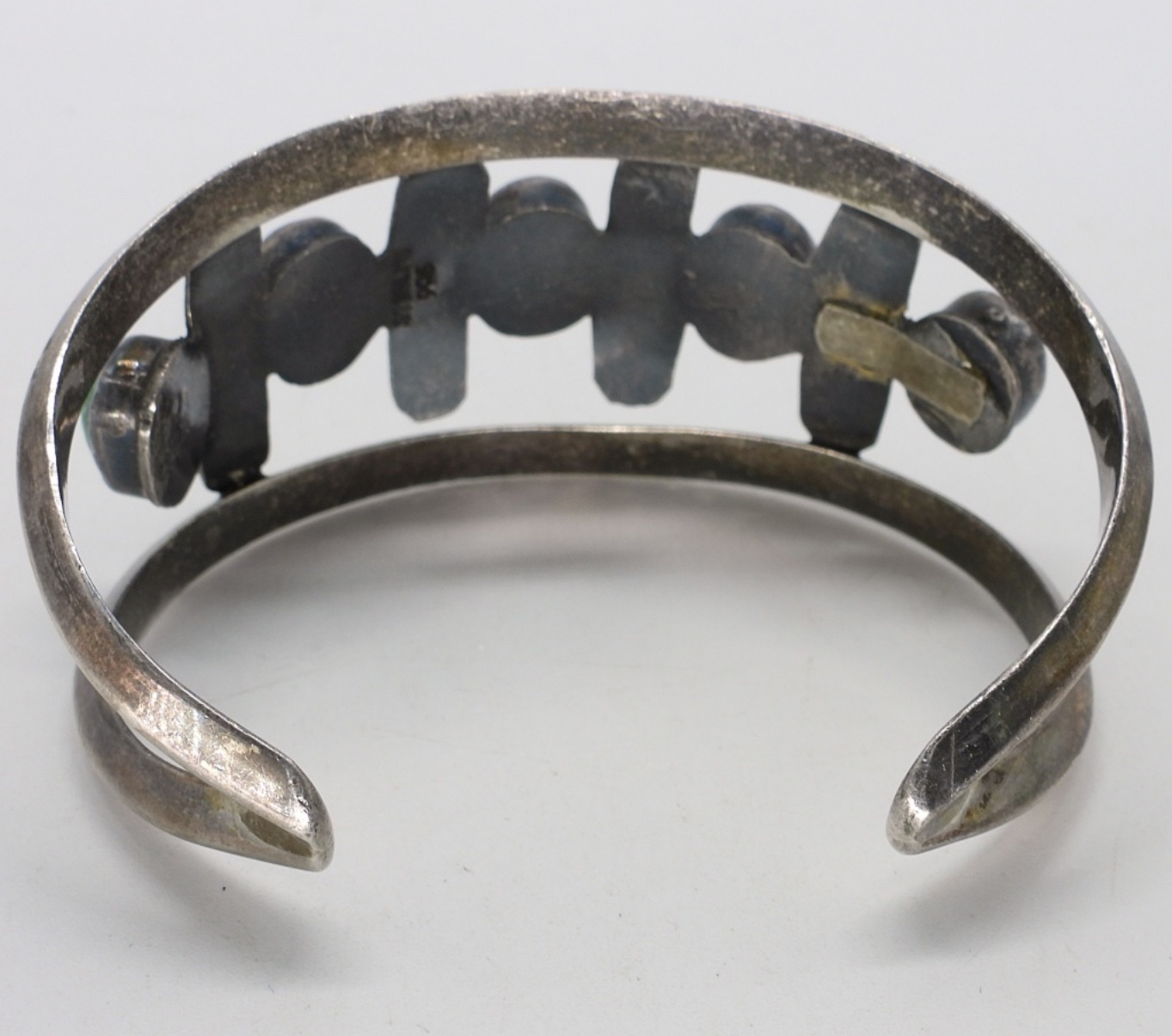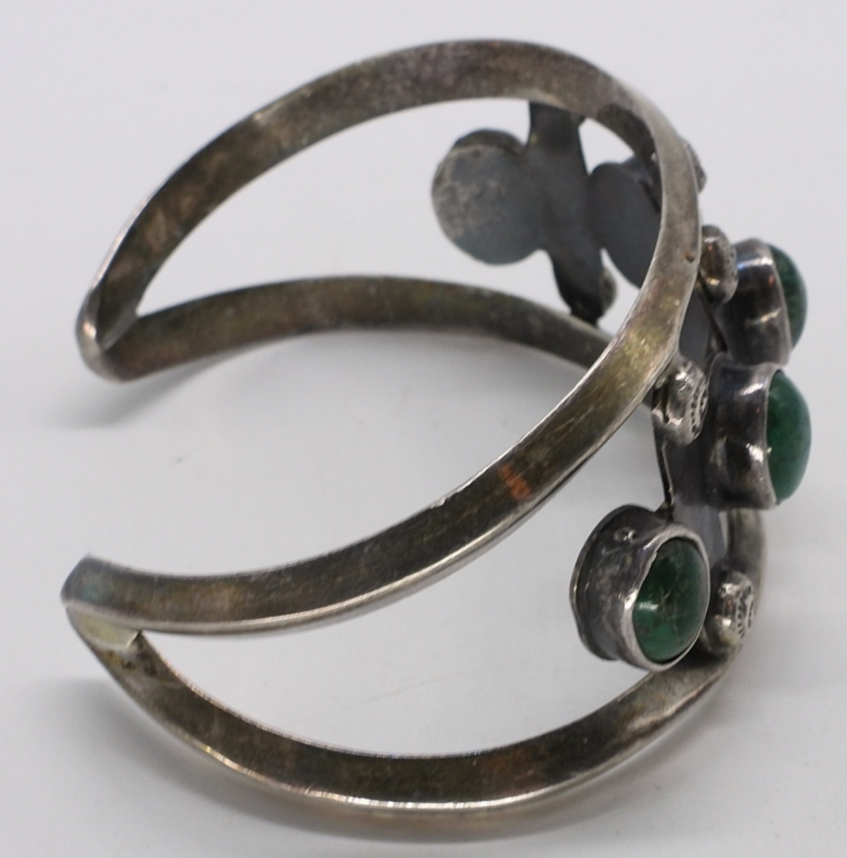 Gorgeous green turquoise cuff bracelet. The back has been repaired at some point. See photos. (27.5 dwt)