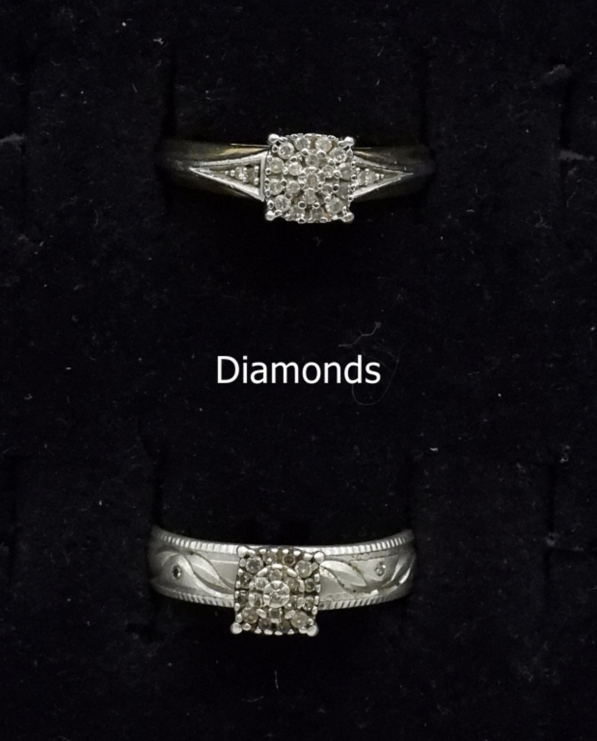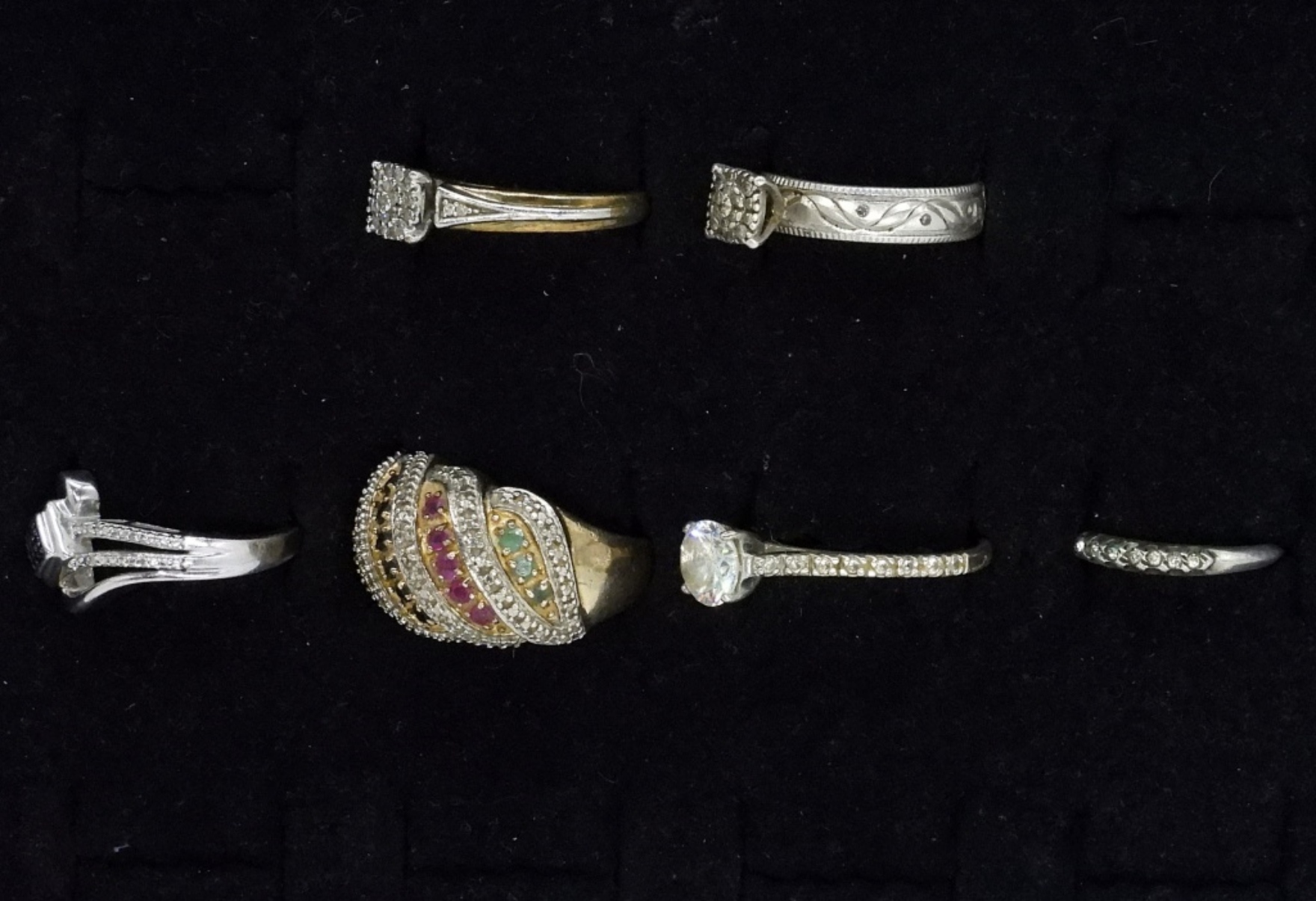 Six sterling rings, two have diamonds (tested). Very pretty rings. Sizes 5.5, 7, 8, 9. Diamond rings are both size 7. (12 dwt)