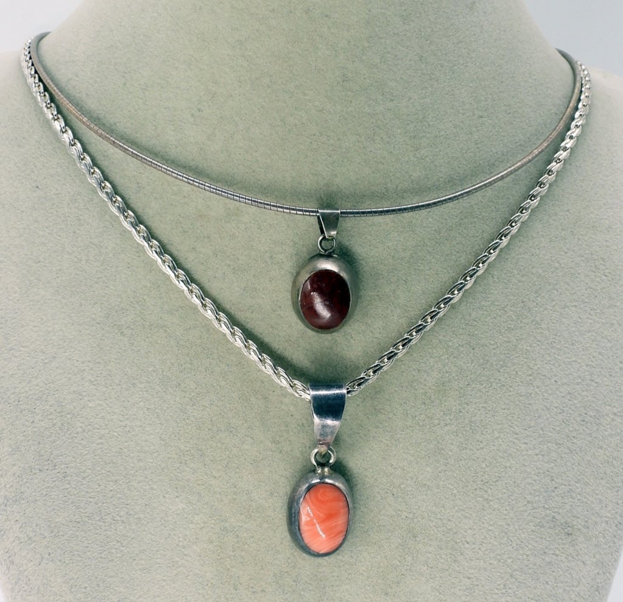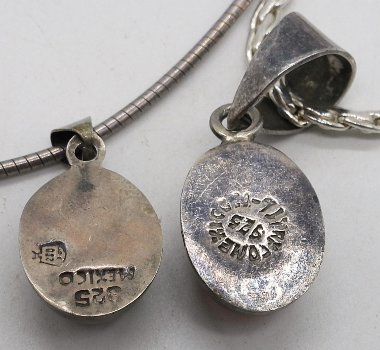 Two sterling necklaces, one is Taxco and one is Mexico. Chains are 16″ & 24″. (18 dwt)