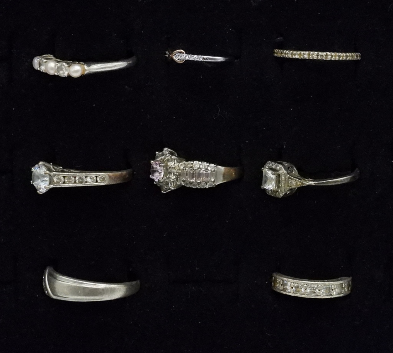 Eight cute sterling fashion rings with simulated diamonds, pink cz and pearls. Sizes 4-12.5 (16 dwt)