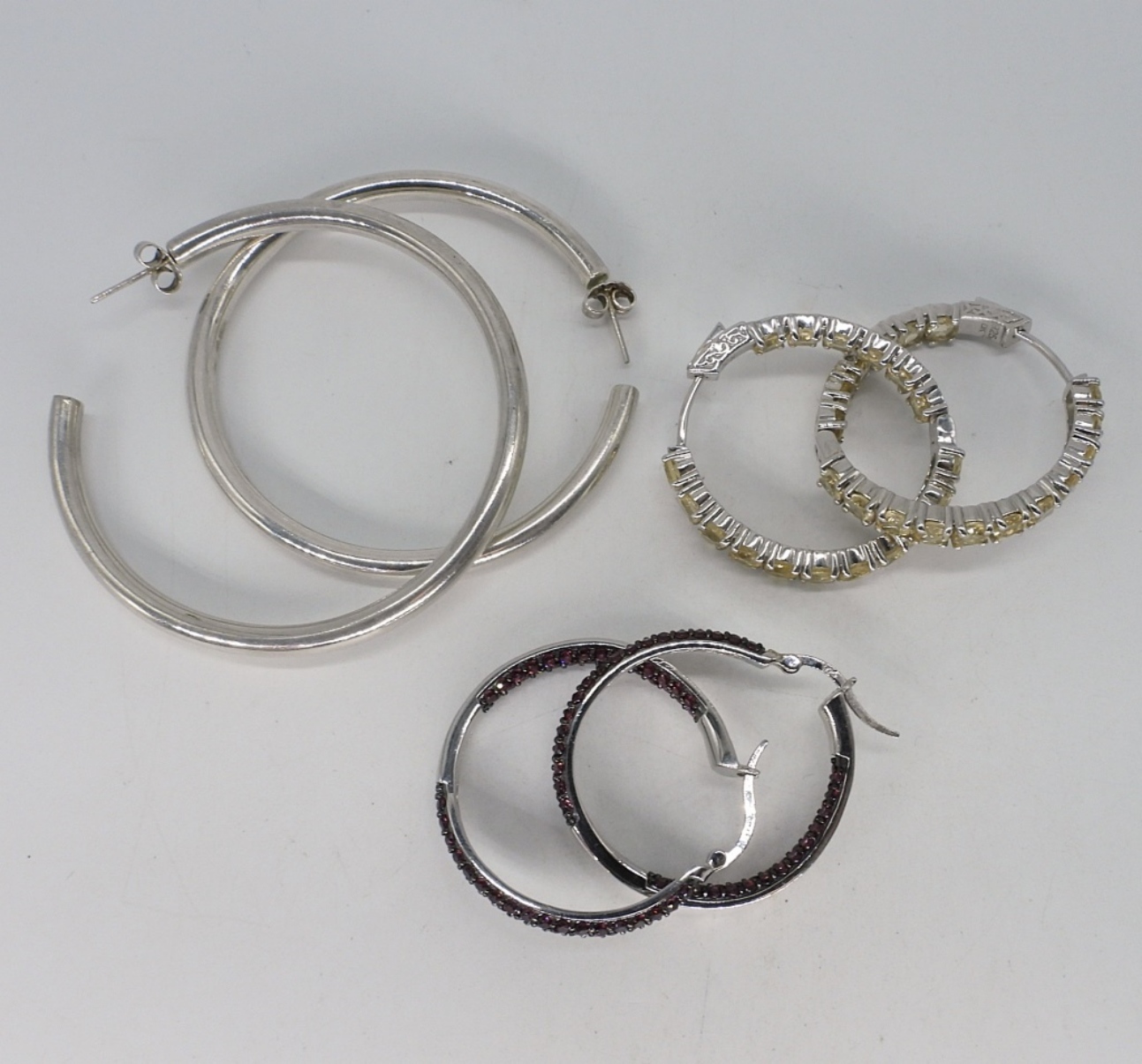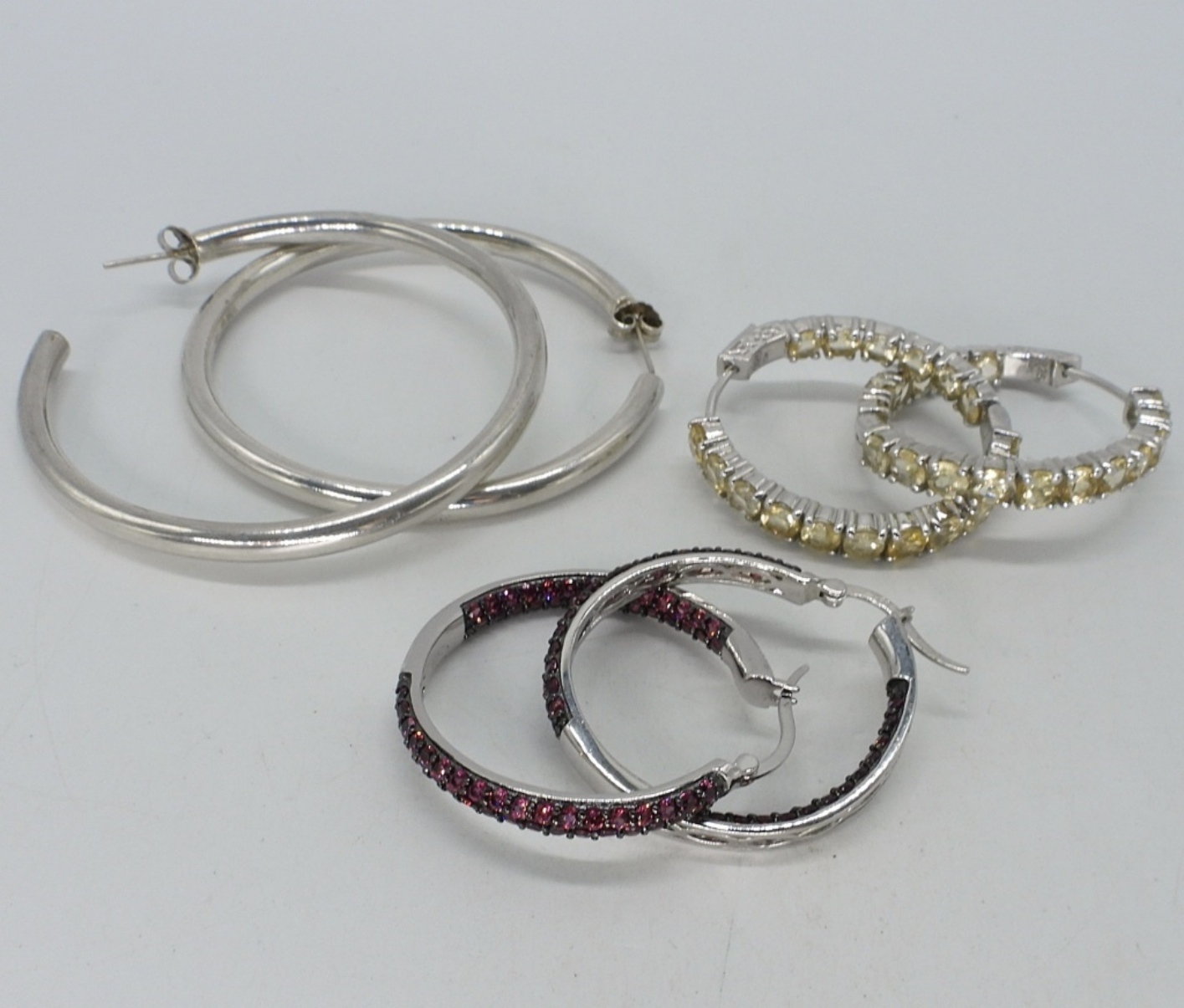 Three pair of pierced sterling hoop earrings. Rhodolite Garnet & a Yellow Gemstone (both likely simulated). 1″, 1.5″ & 2″. (16 dwt)