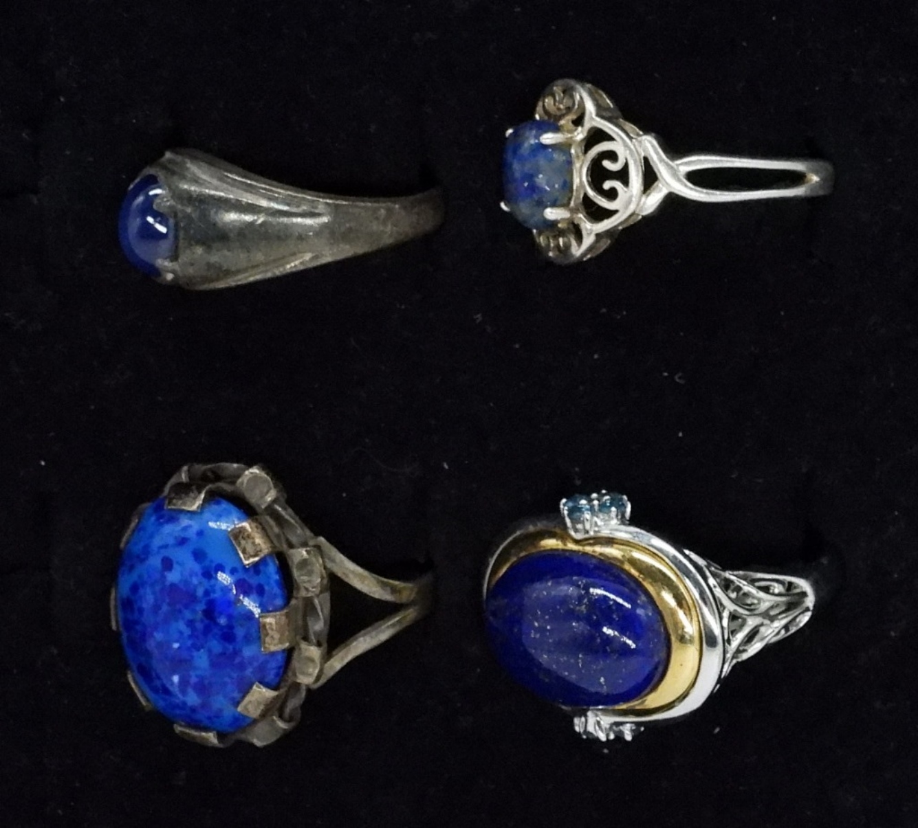 Four sterling, lapis lazuli and blue cats eye gemstone rings, size 8 & 9. (12 dwt)