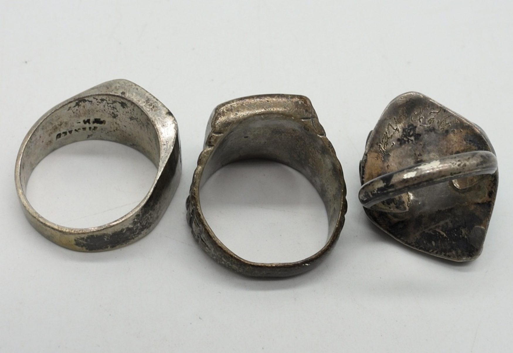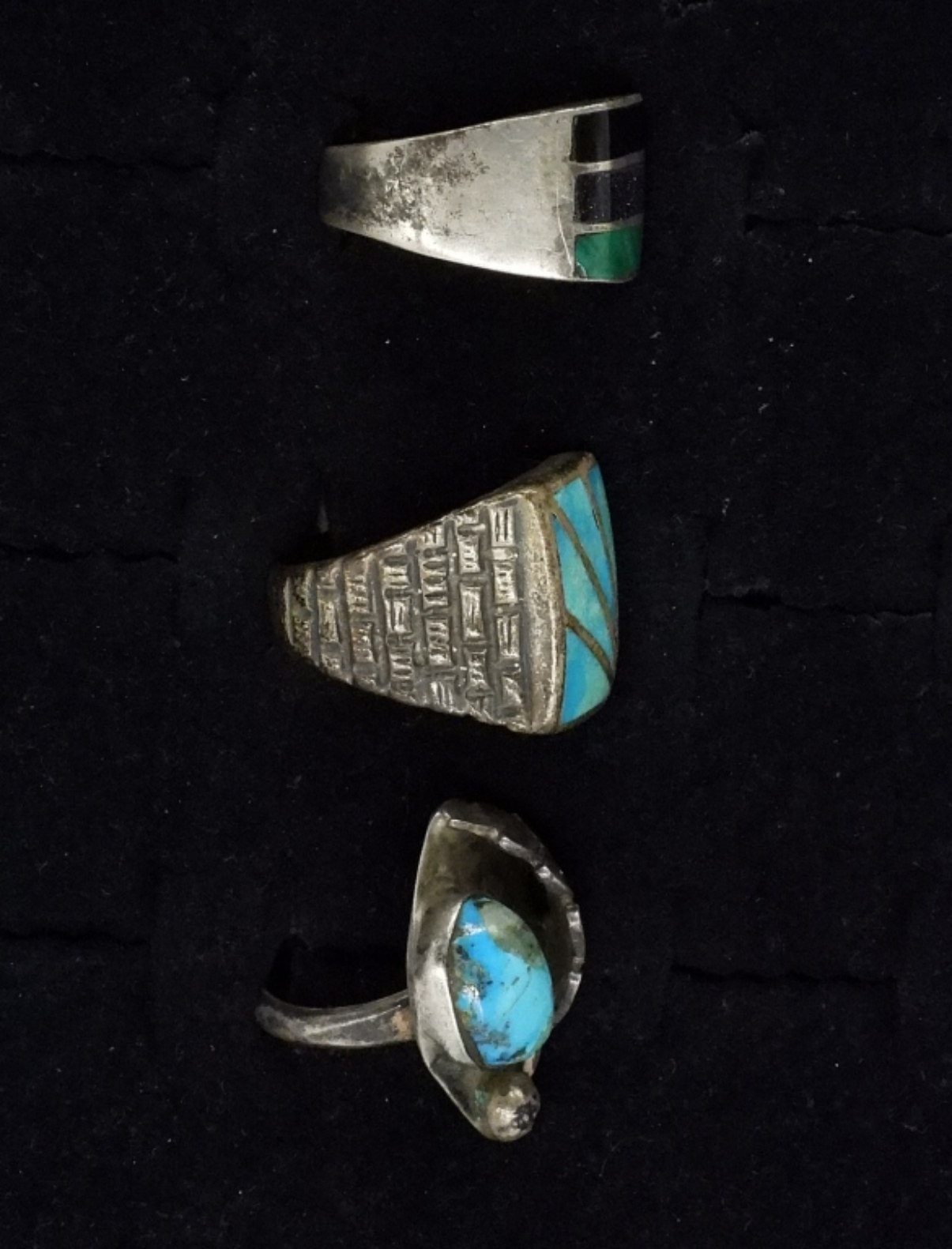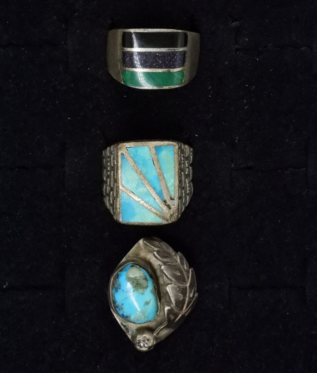 Three sterling rings with turquoise, gold stone and black onyx gemstones. Sizes 6, 9, 10. (17 dwt)