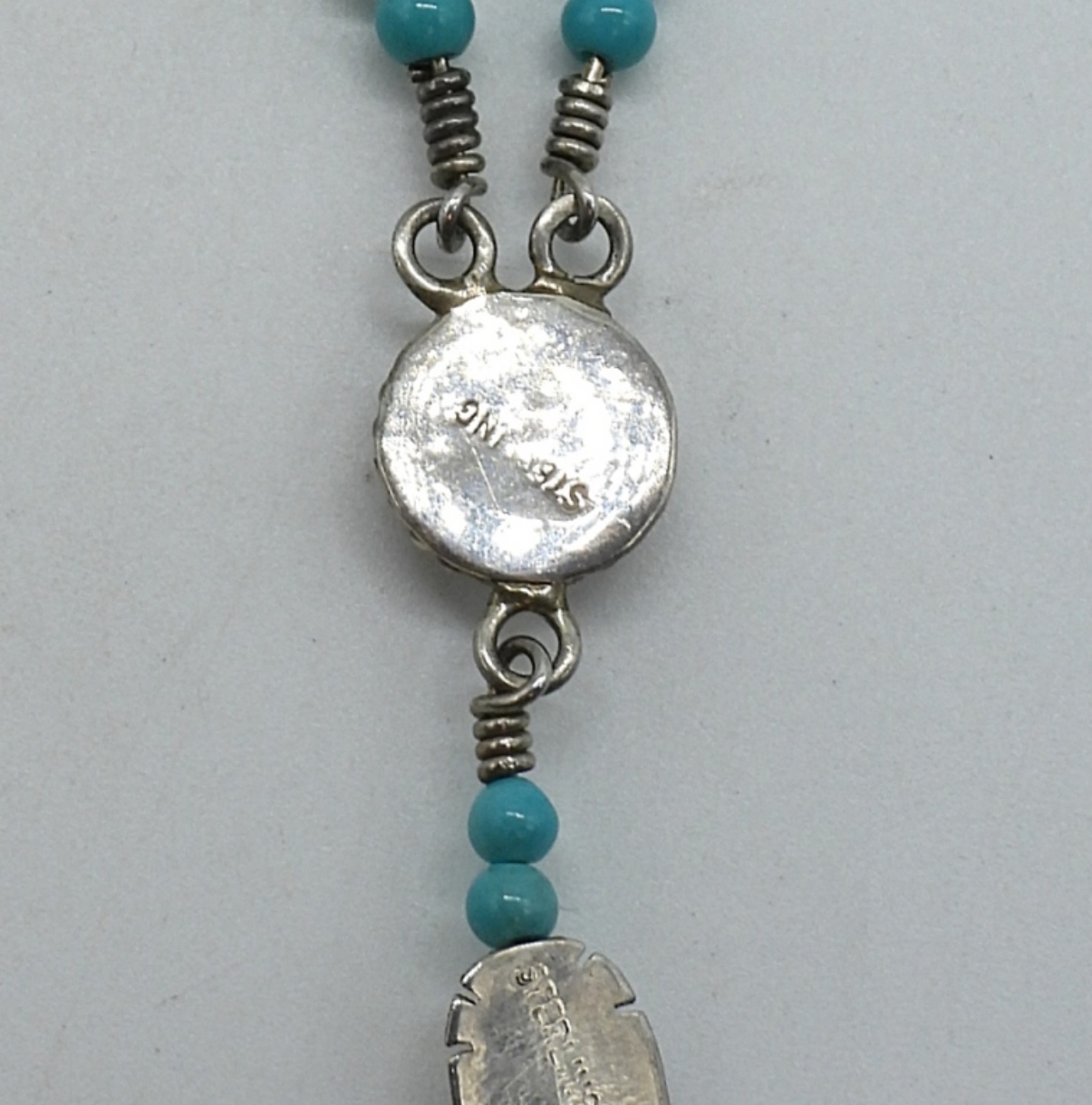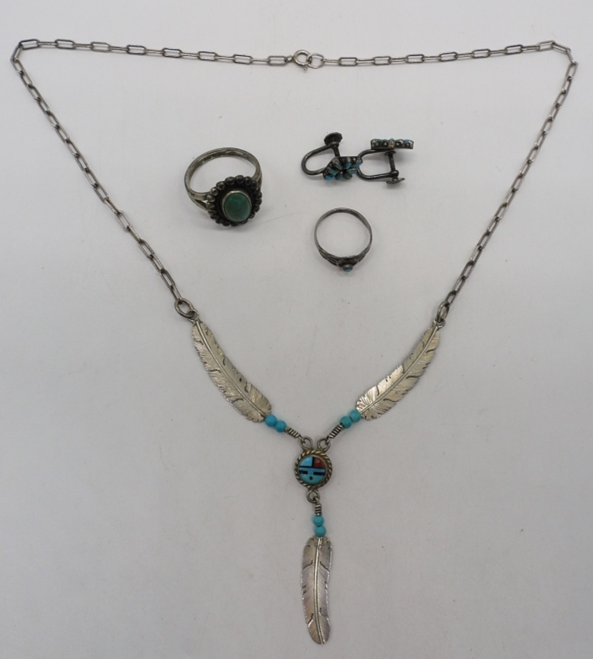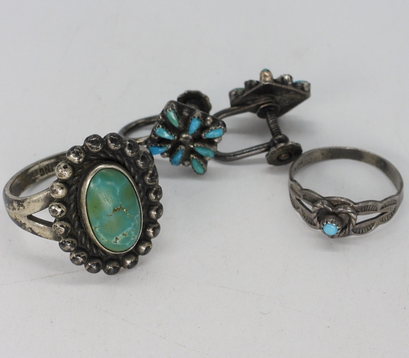 Two sterling rings with turquoise gemstones, size 3.5 & 7. Screw back turquoise earrings. Necklace is 20″ long. (10 dwt)