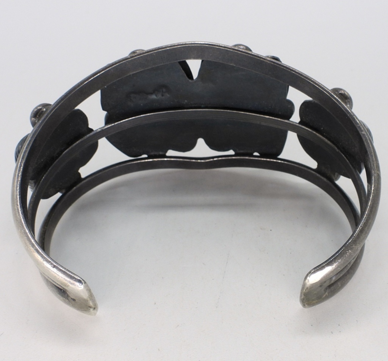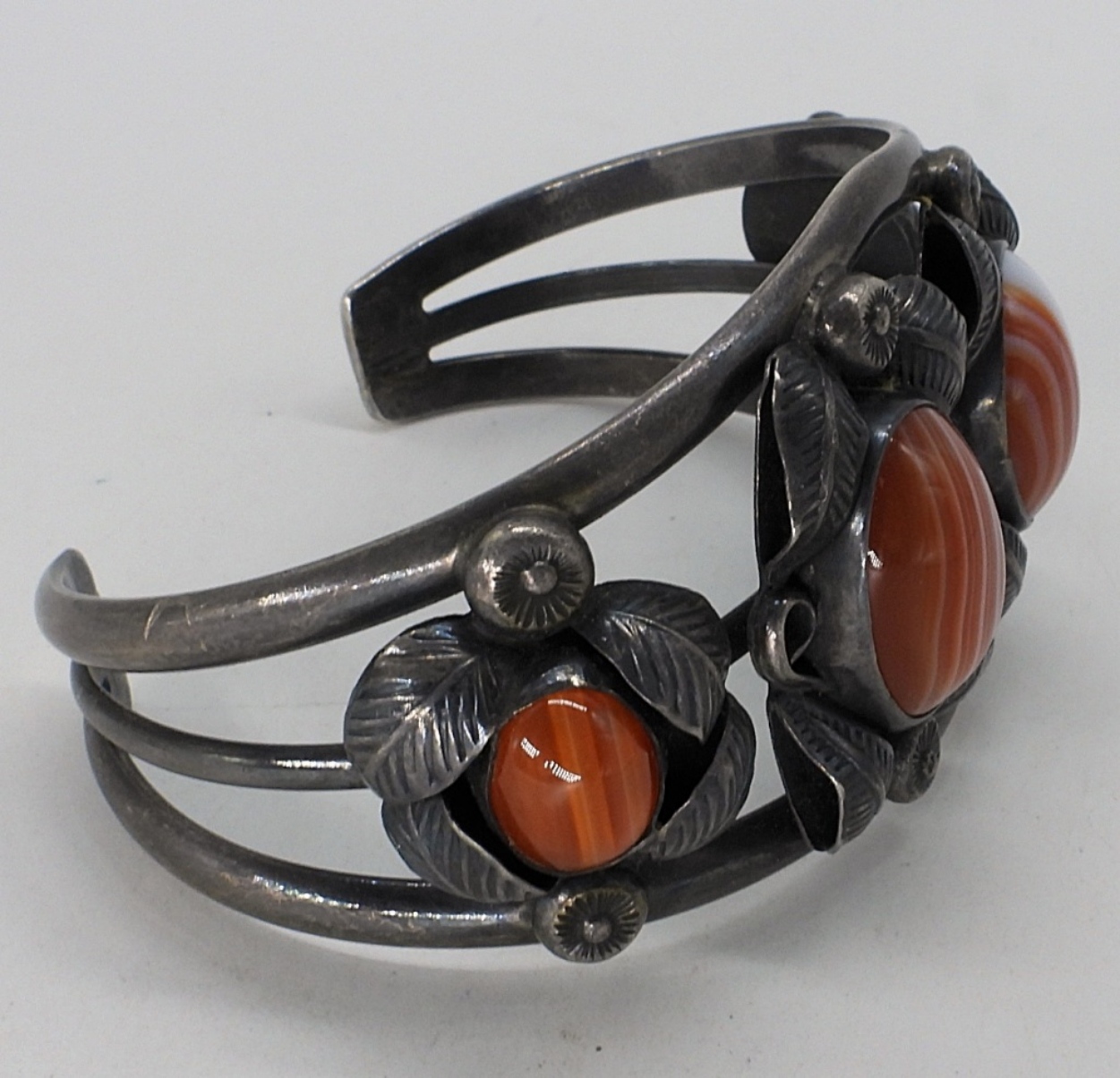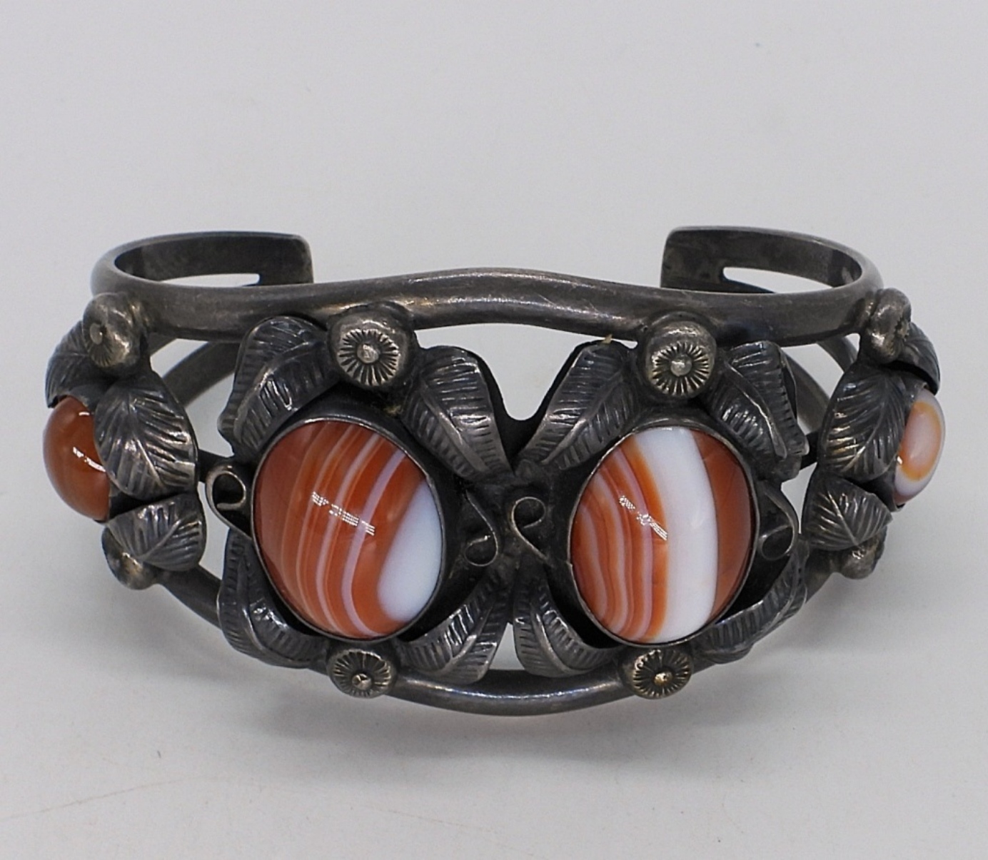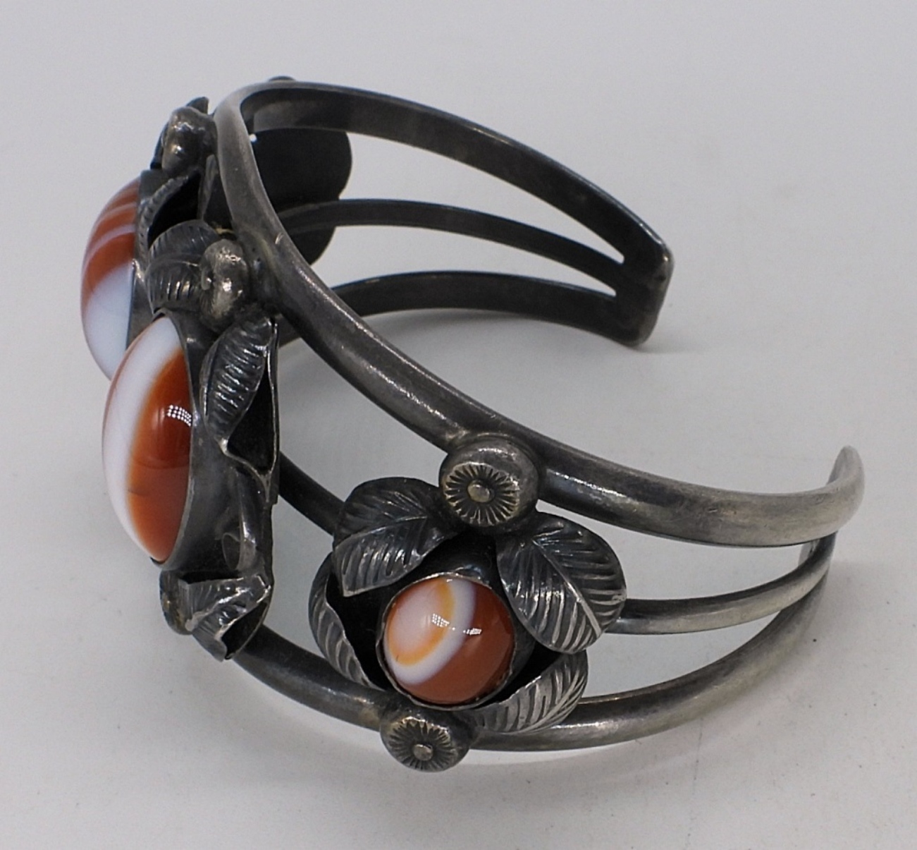 Sterling cuff bracelet with Banded Carnelian gemstones. Inside marked “F (arrow) A”. Top is 1.5″ wide. Heavy piece. (27 dwt)