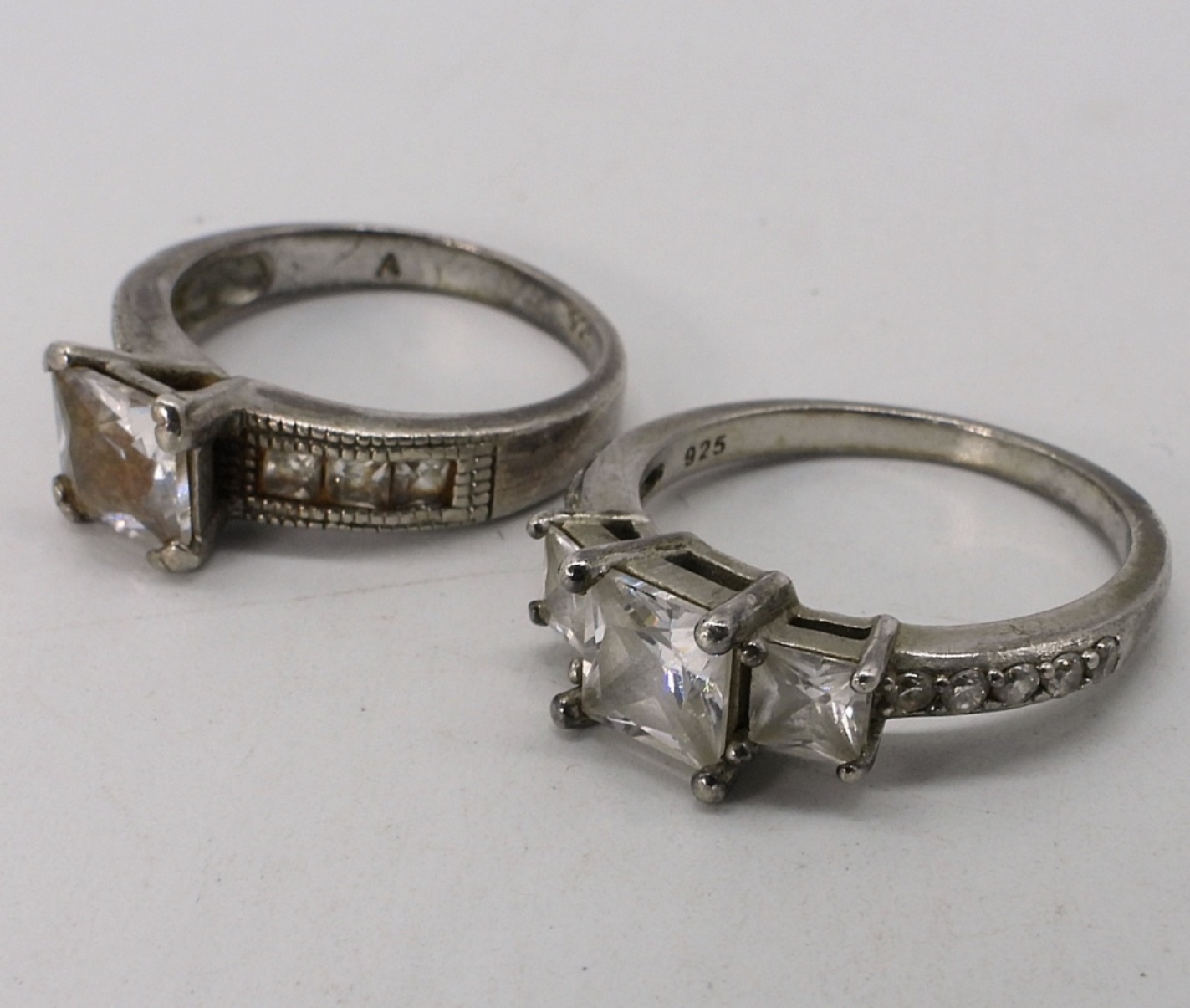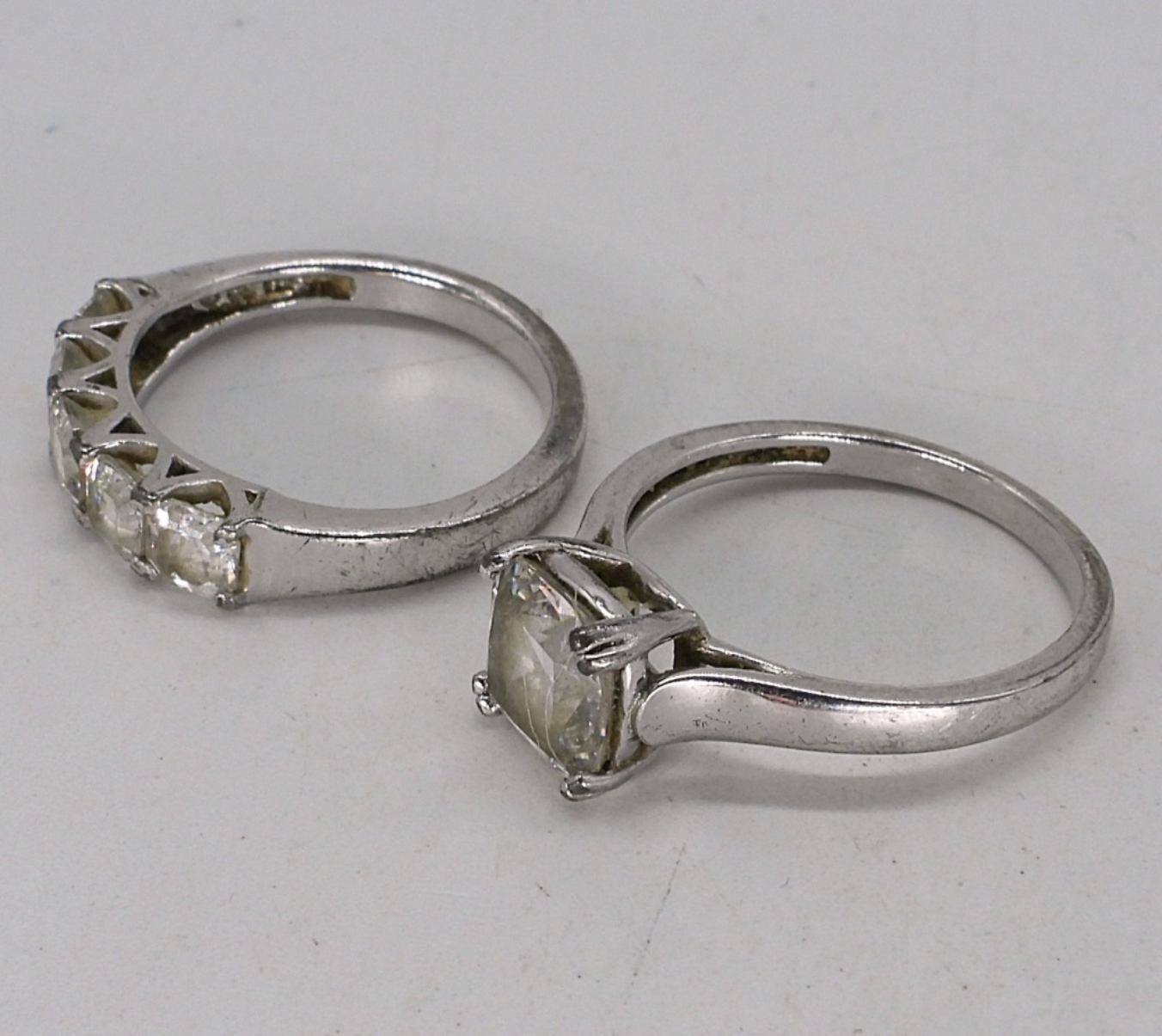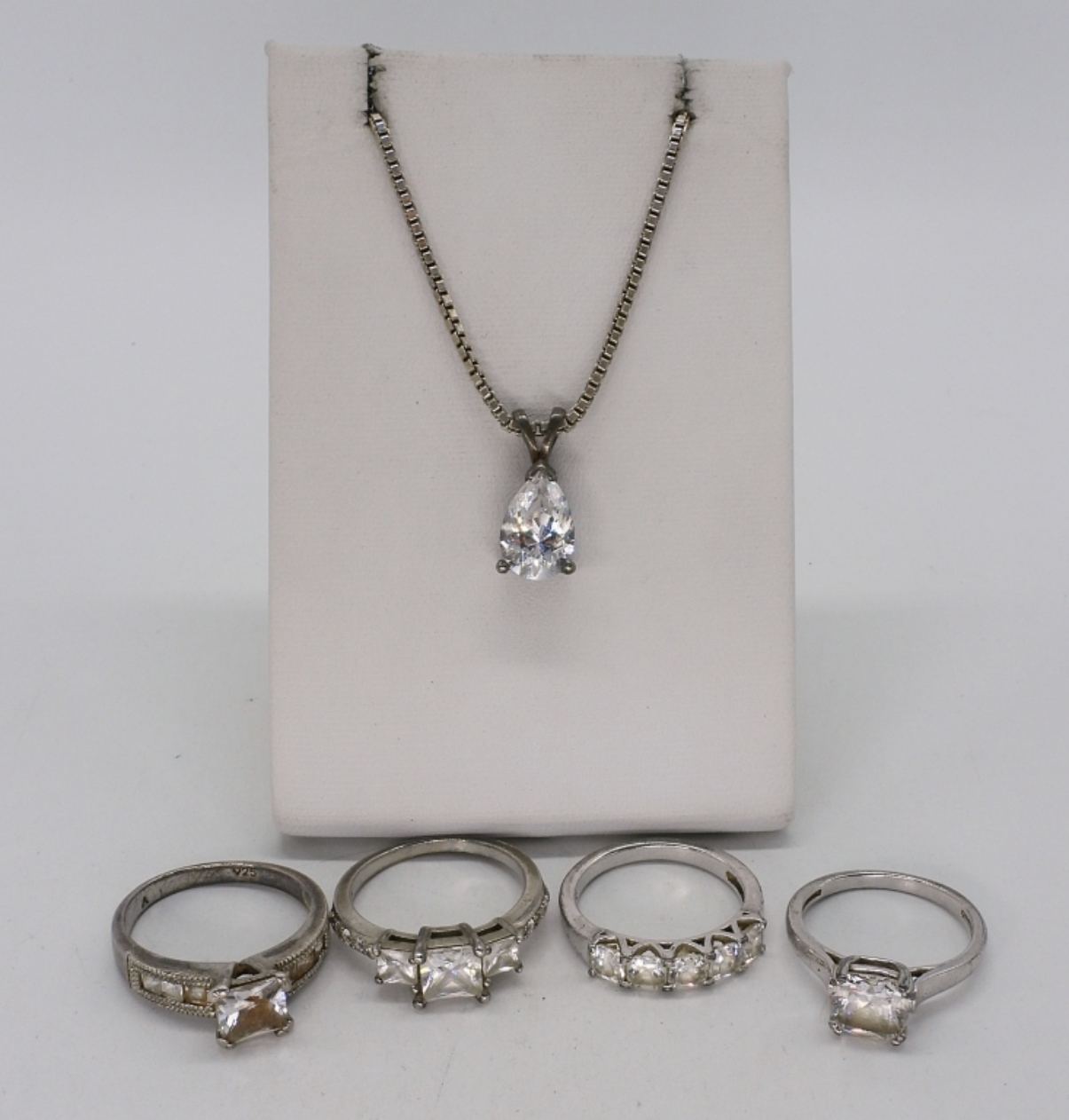 Four bridal style rings with simulated diamond gemstones. Sizes 7 & 8. Simulated diamond pear shaped necklace, 16″ long. (10.7 dwt)