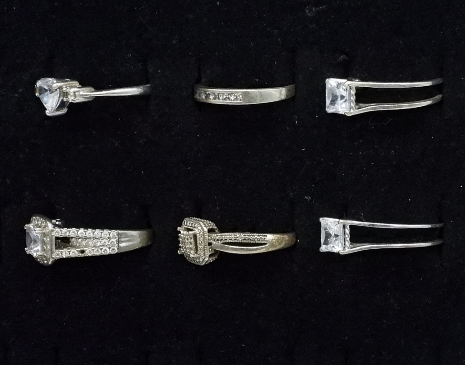 Six sterling rings with simulated diamond gemstones. Sizes 7 & 8. (10 dwt)