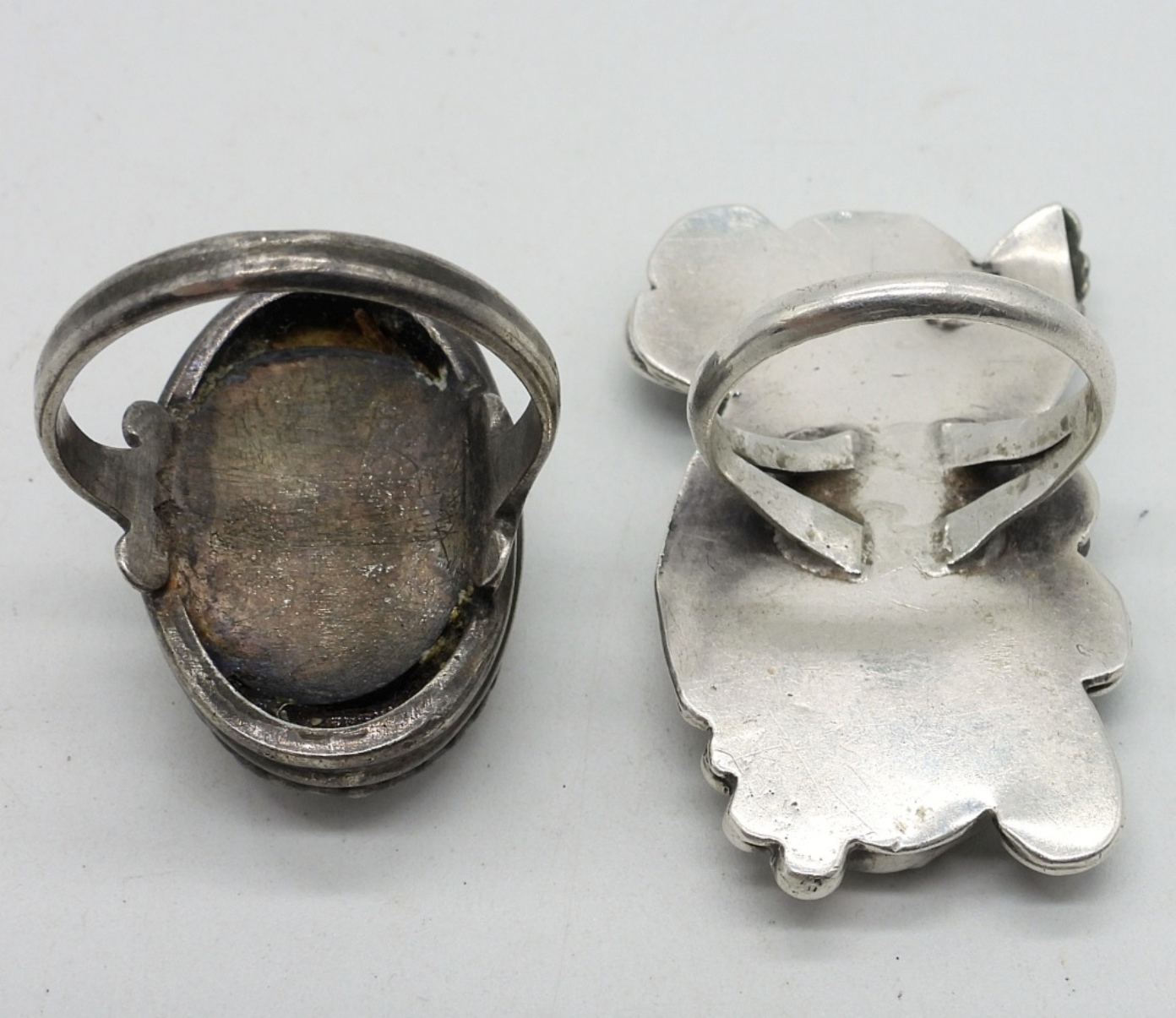 Two gorgeous large sterling rings with opal and mother of pearl gemstones. Ring sizes 8 & 11. Opal top measures 1″ long. Mother of pearl ring top measures 2′ long. (15 dwt)