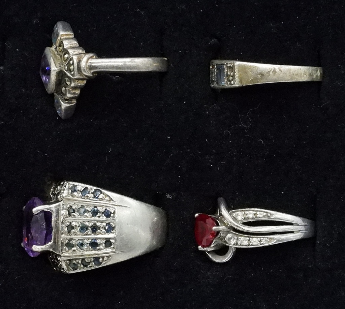 Four sterling rings with gemstones. Amethyst, blue topaz, citrine & simulated ruby. Sizes 6.5 & 8. (12 dwt)