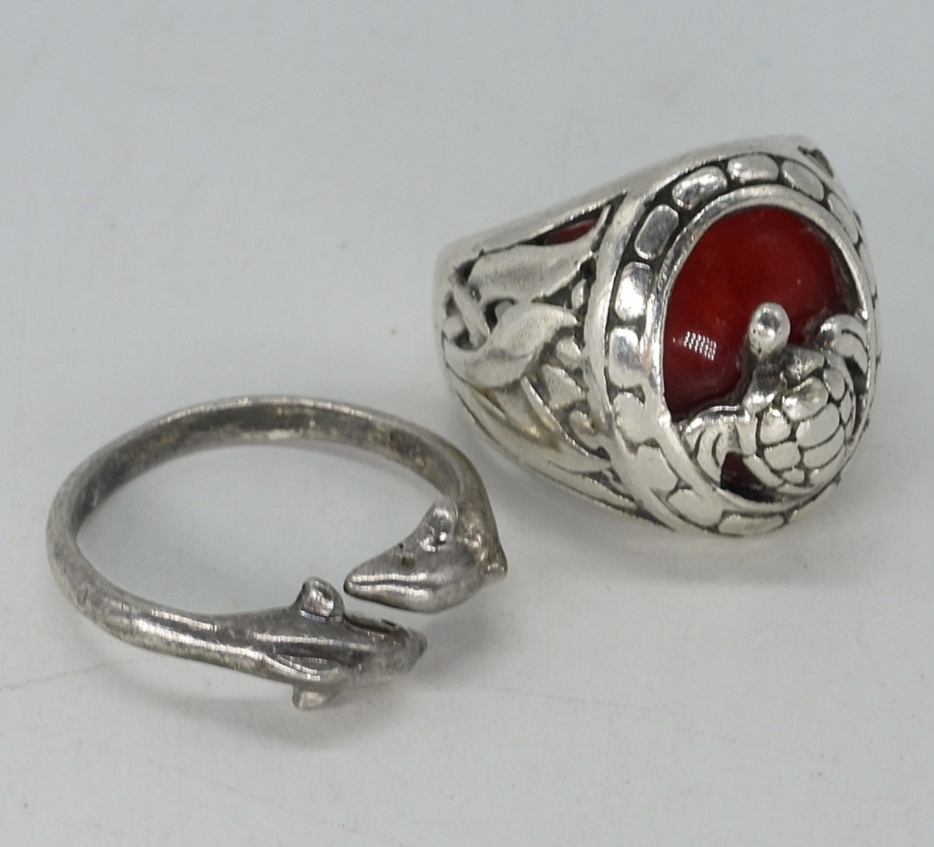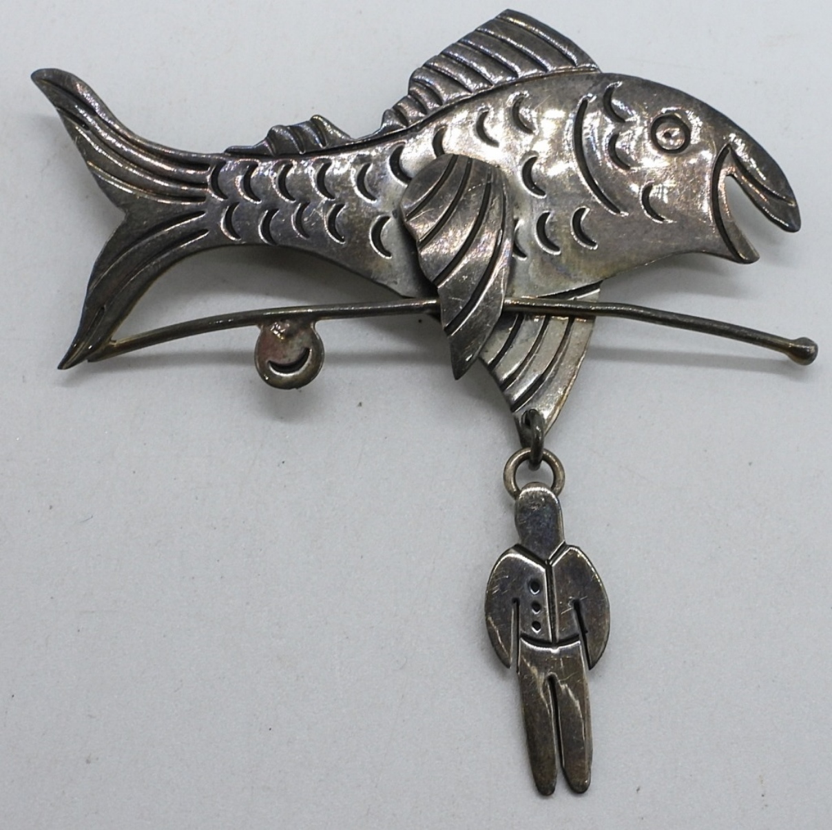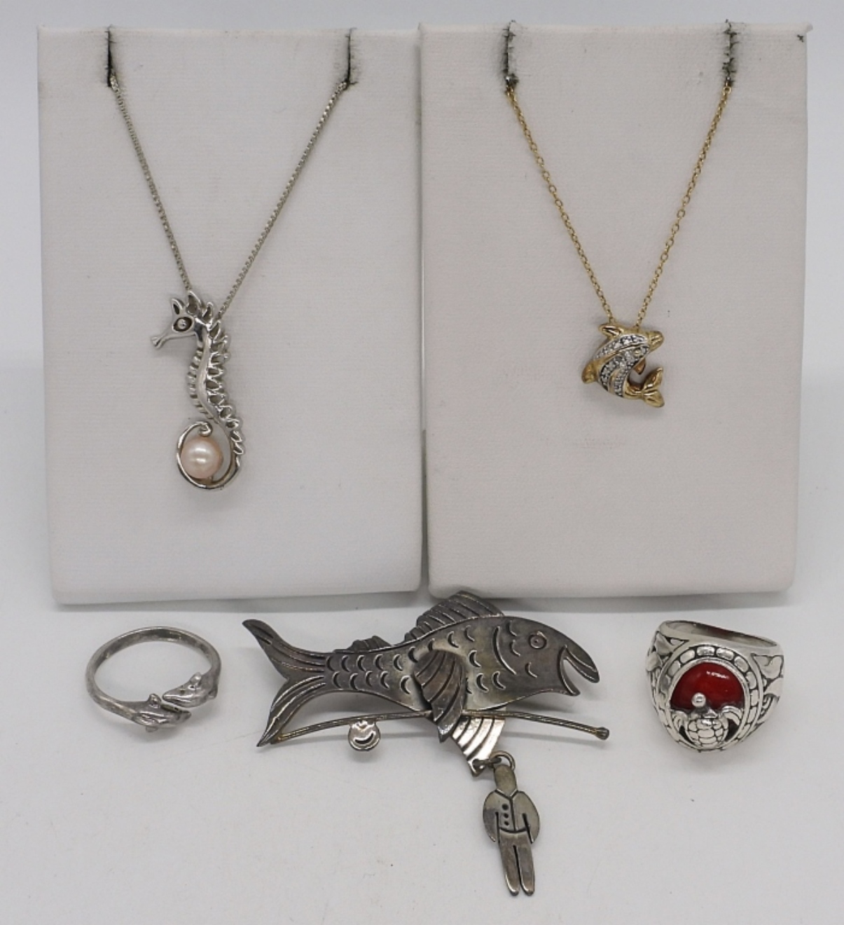 Two sterling necklaces, 16″ & 18″. Two sterling rings, sizes 6 & 7. Far Fetched brand, sterling fish pin, 2″. (15.2 dwt)