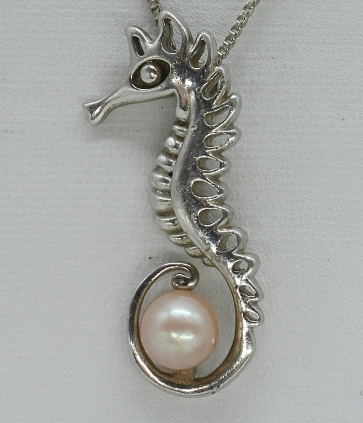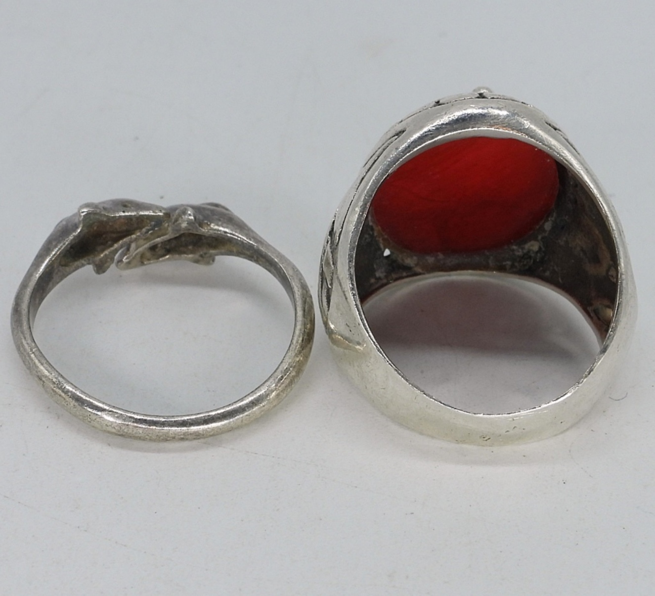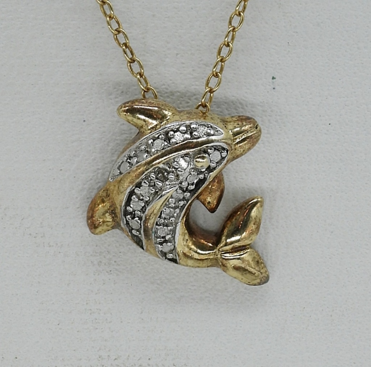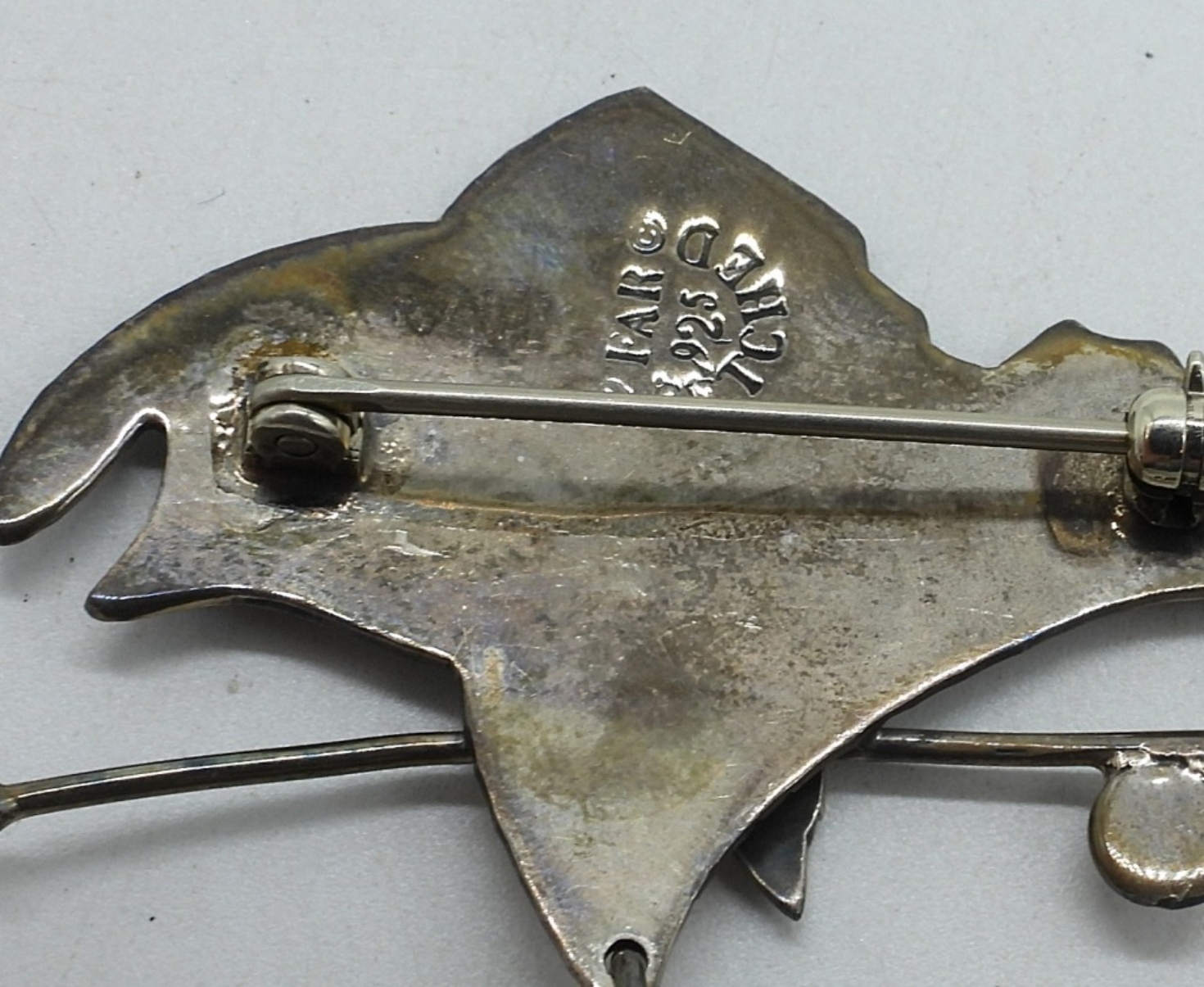 Two sterling necklaces, 16″ & 18″. Two sterling rings, sizes 6 & 7. Far Fetched brand, sterling fish pin, 2″. (15.2 dwt)
