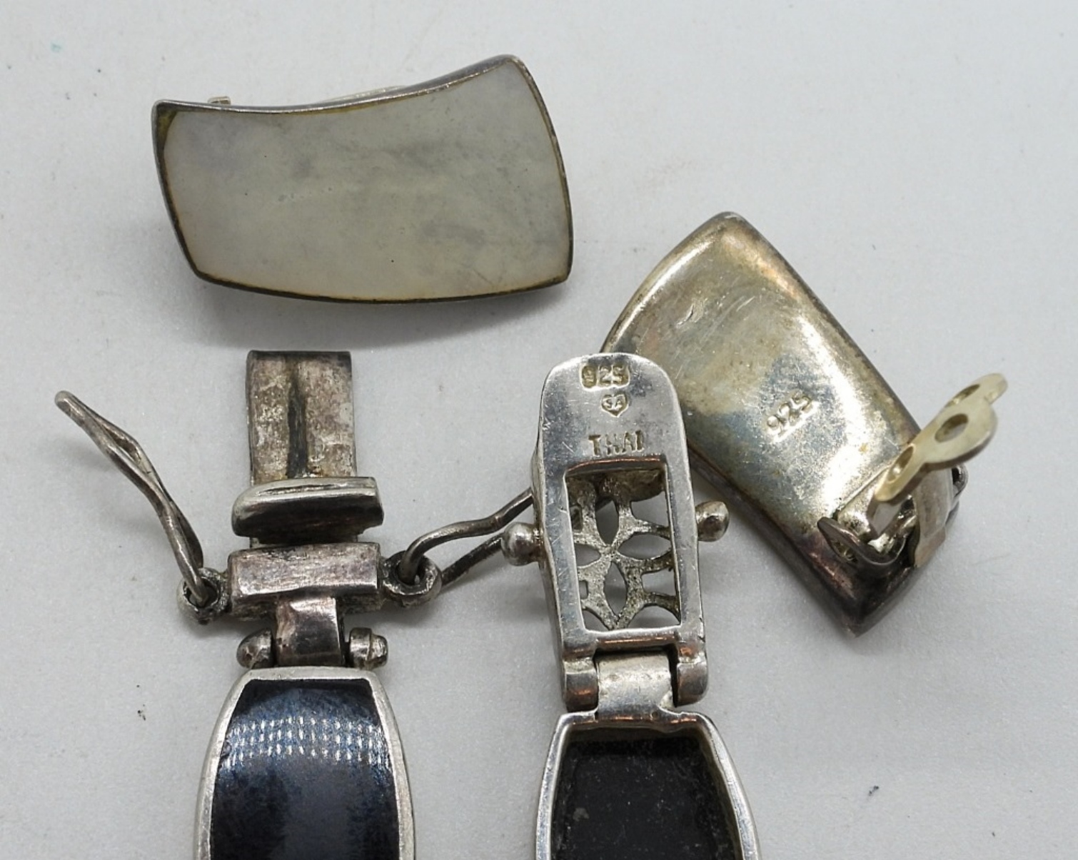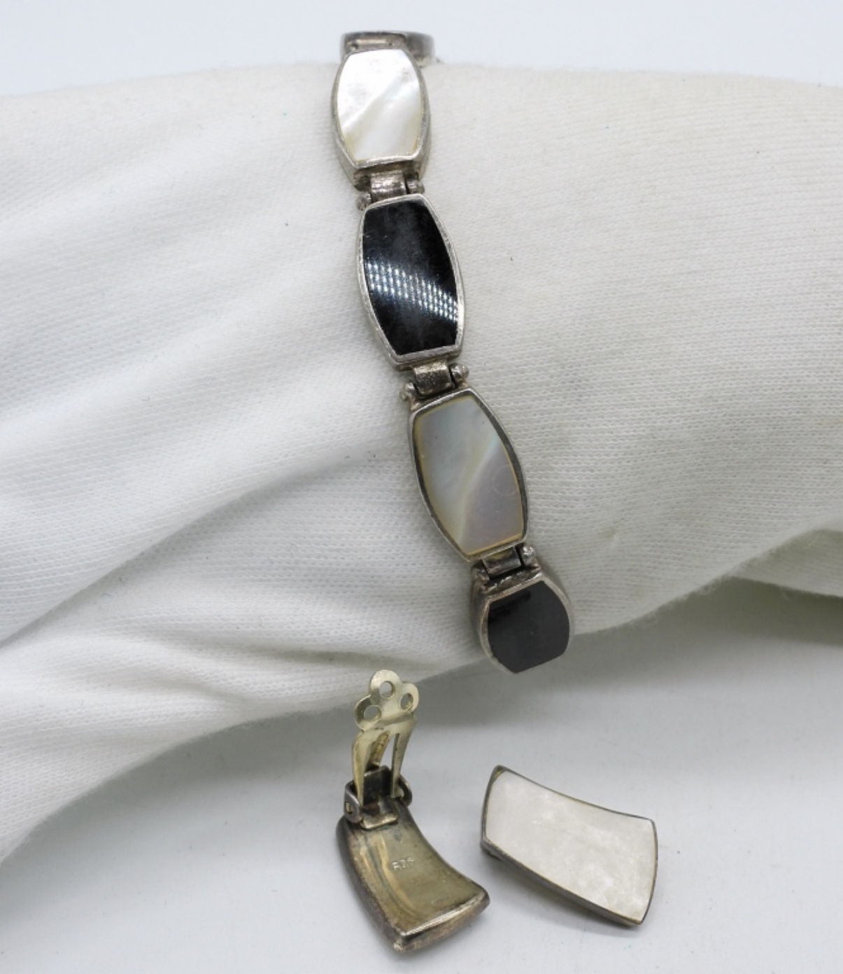 Black onyx and mother of pearl bracelet, 7″ long. Vintage sterling mother of pearl clip on earrings, 1″ long. (14 dwt)