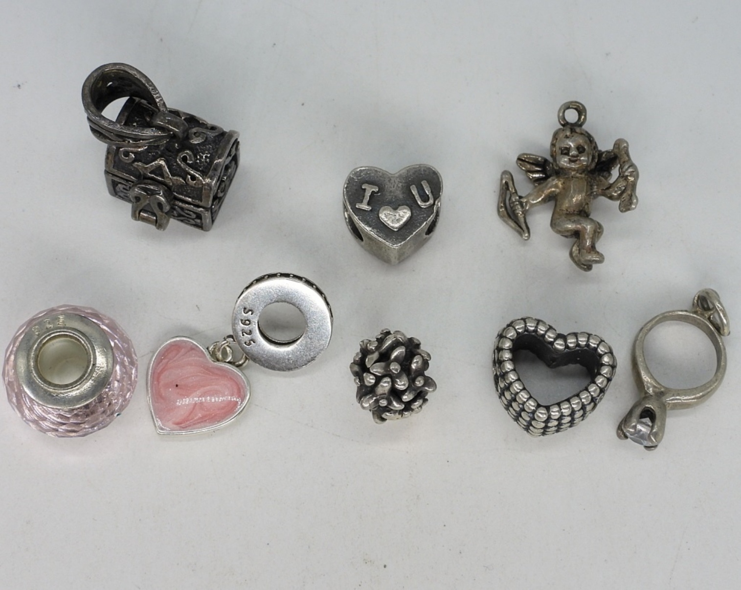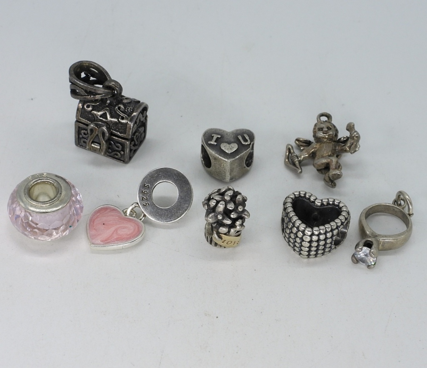 Eight sterling modern charms, fits pandora style bracelets. (13 dwt)
