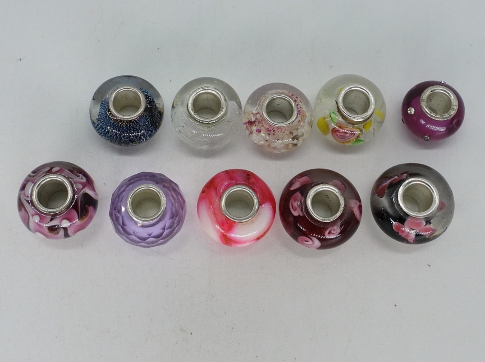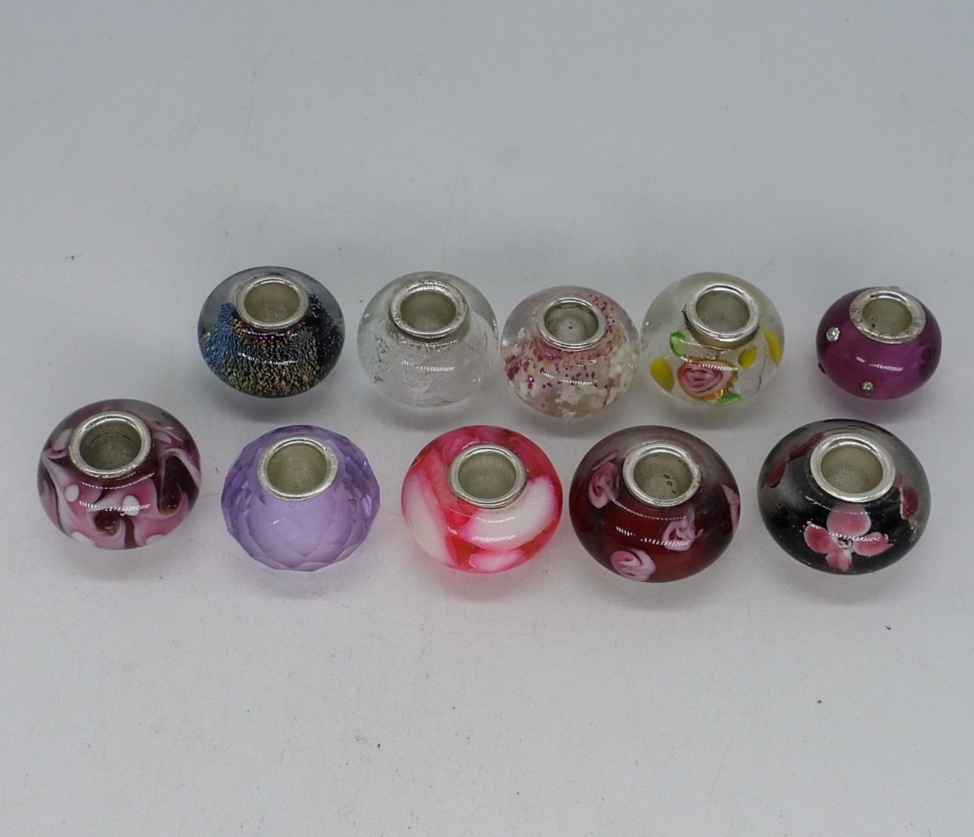Ten unbranded sterling and glass, charms. Will fit pandora style charm bracelets. (5 dwt)