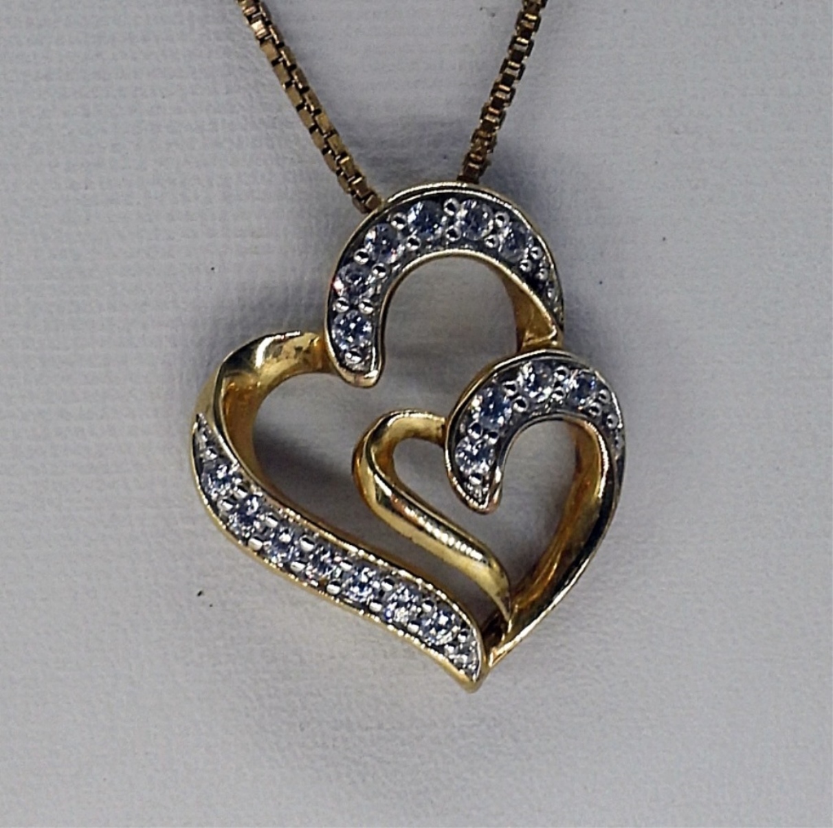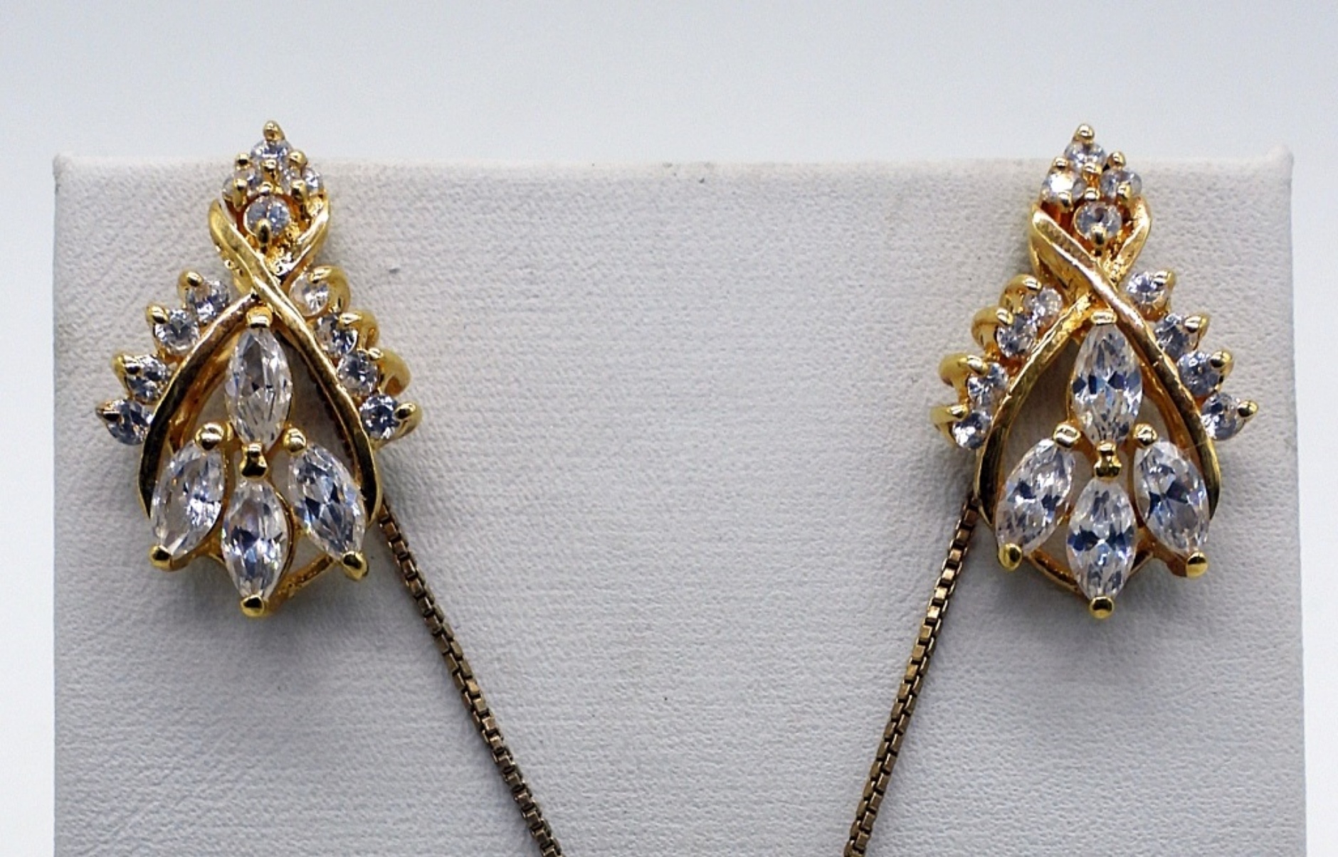 Gold tone sterling heart shaped necklace and bracelet. Pierced earrings, 1″ long. Necklace is 18″ long. Bracelet is 7″ long. (10 dwt)
