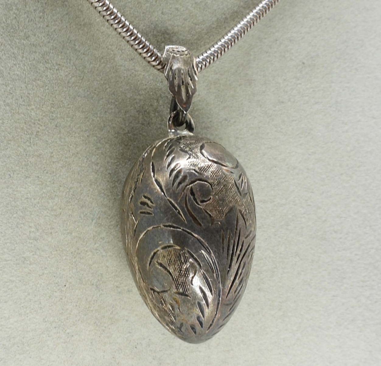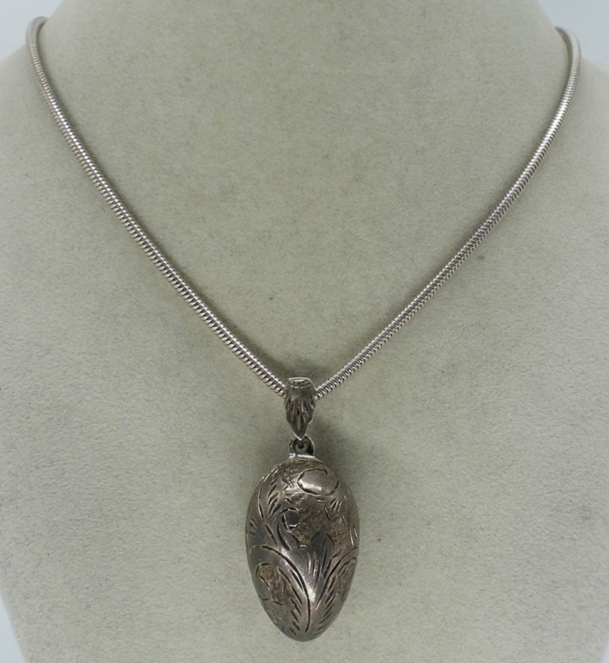 Vintage sterling egg shaped pendant (2″ long) on a 22″ sterling chain. (14.9 dwt)