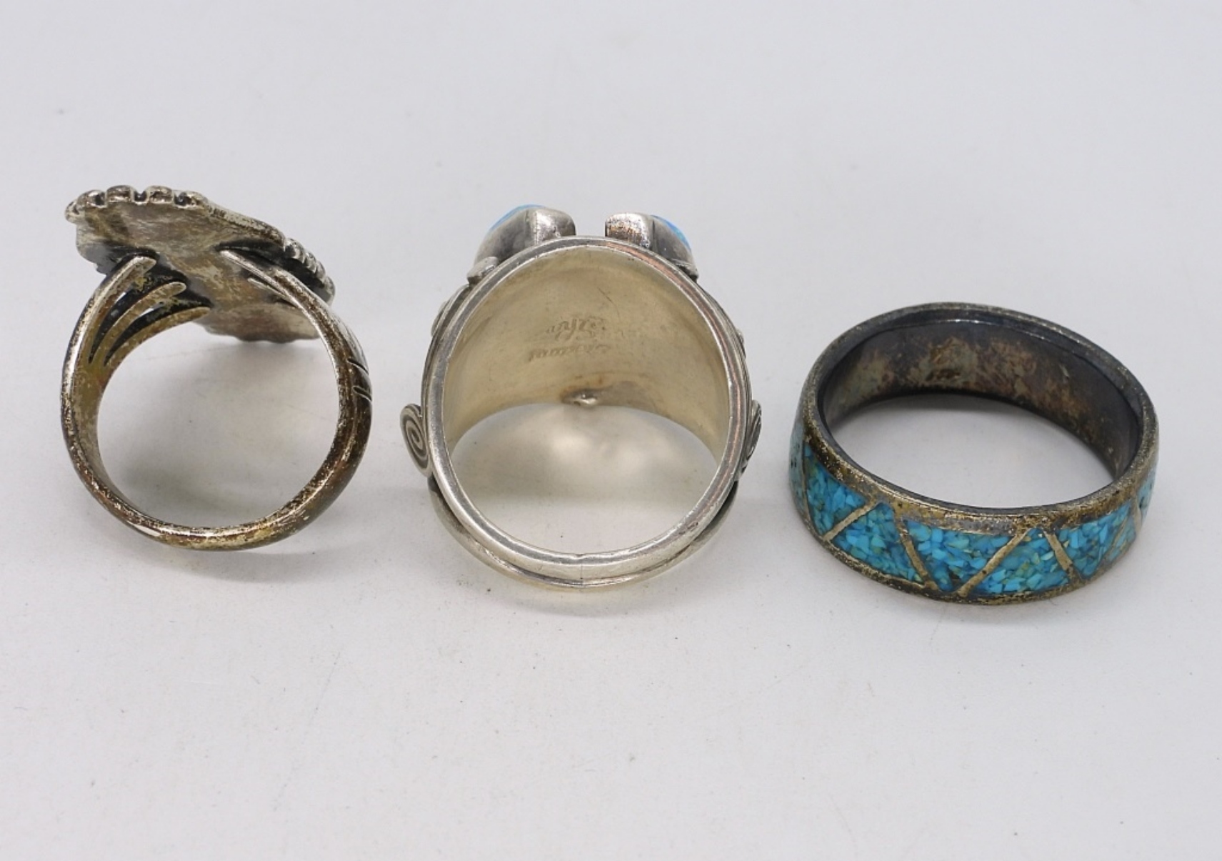 Three sterling rings, Opal horse shoe (size 7). Turquoise band (size 11). Oblong silver ring (size 5.5). (12 dwt)