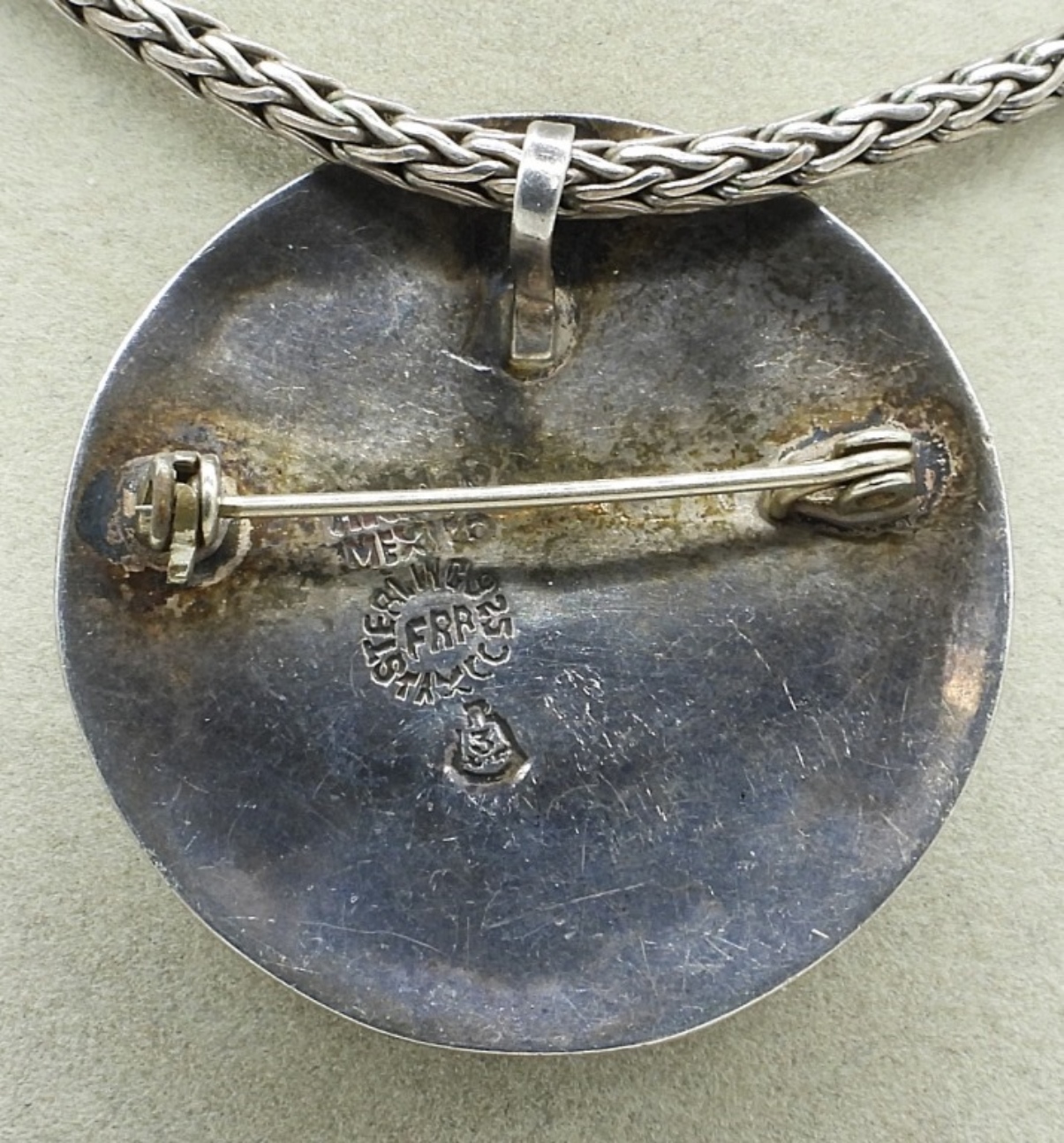 Mexico sterling zodiac pendant/pin, 1.5″. On a sterling 16″ chain. (16.5 dwt)