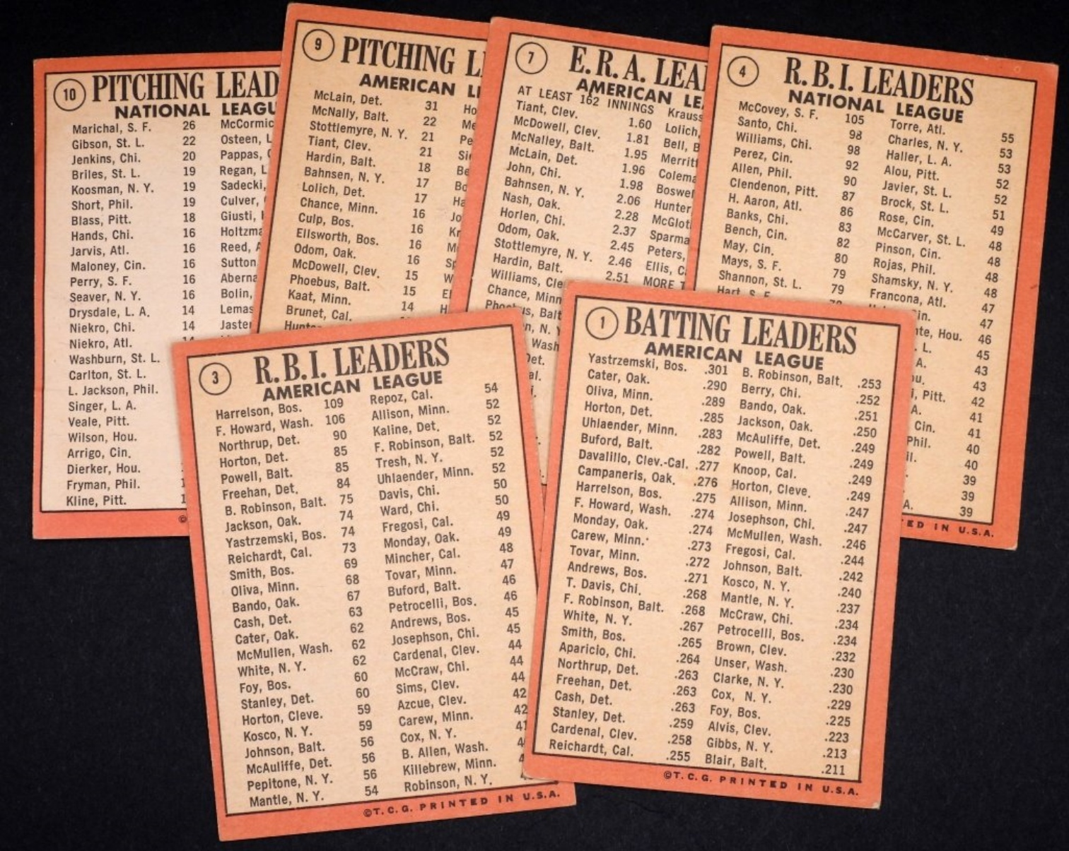 #1 Batting Leaders 2) #3 R.B.I Leaders 3) # 4 R.B.I Leaders 4) #7 E.R.A Leaders 5) #9 Pitching Leaders 6) #10 Pitching Leaders