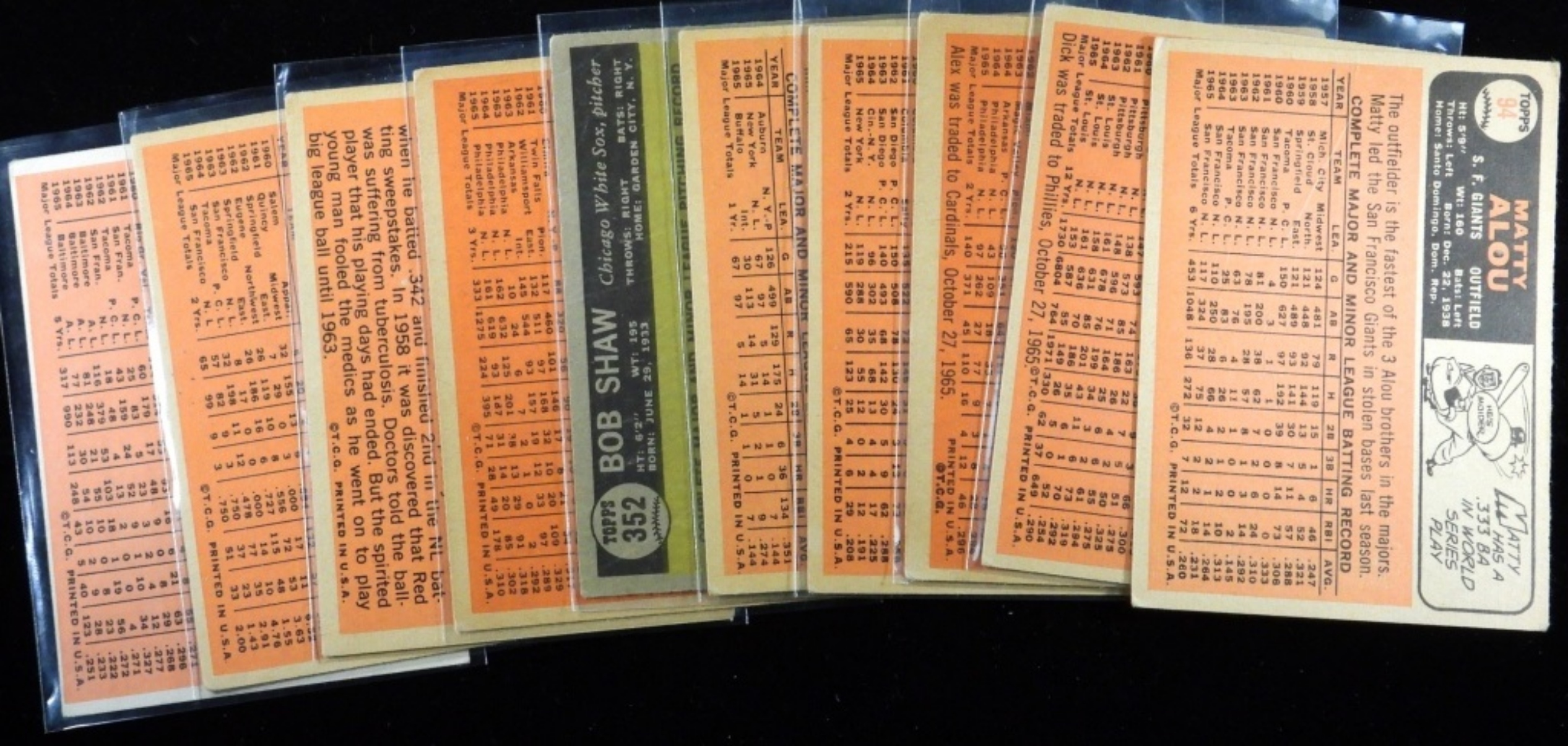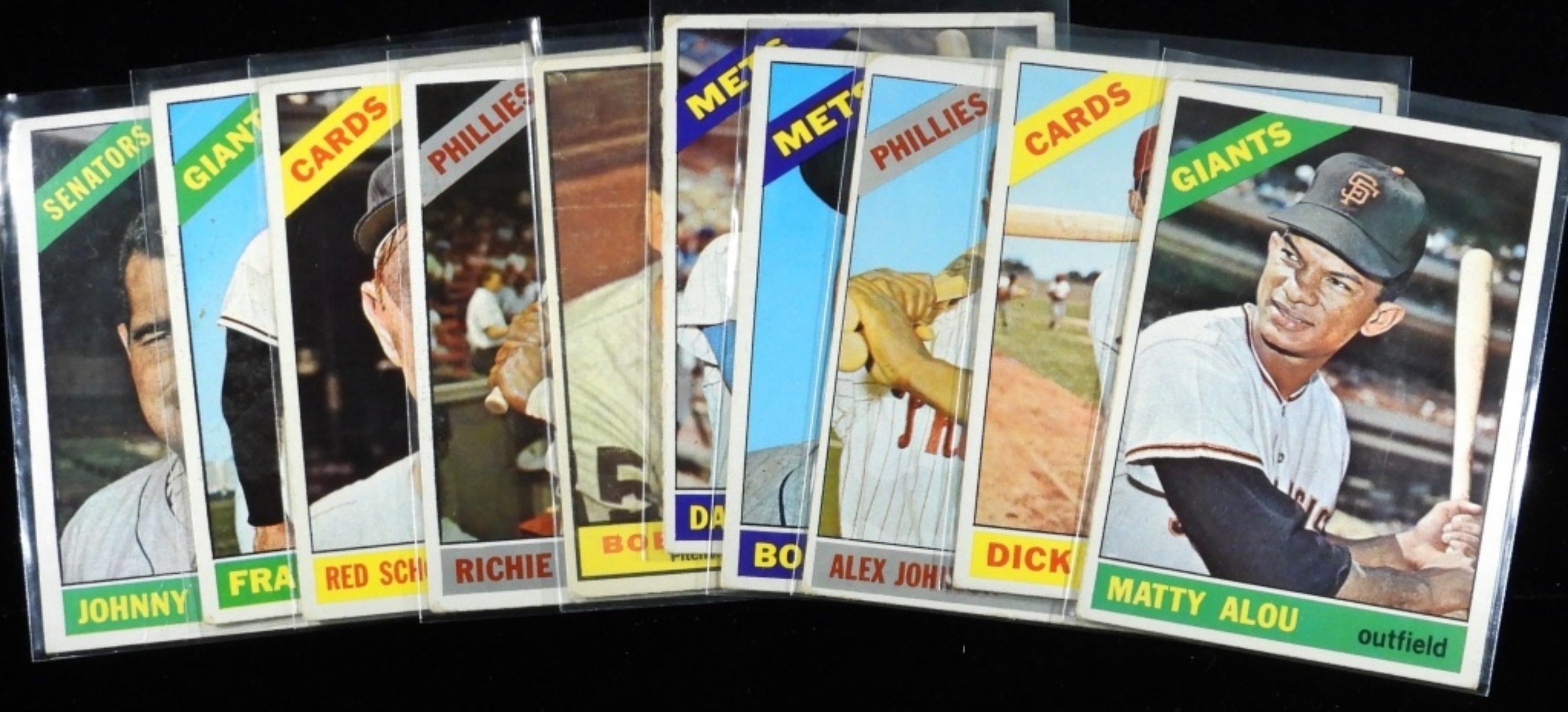 1) #77 Johnny Orsino VG. 2) #78 Frank Linzy G. 3) #76 Red Schoendienst G. 4) #80 Richie Allen VG. 5) #352 Bob Shaw G. (There is a bend through the card.) 6) #87 Dan Napoleon G. 7) #108 Bobby Klaus VG. 8) #104 Alex