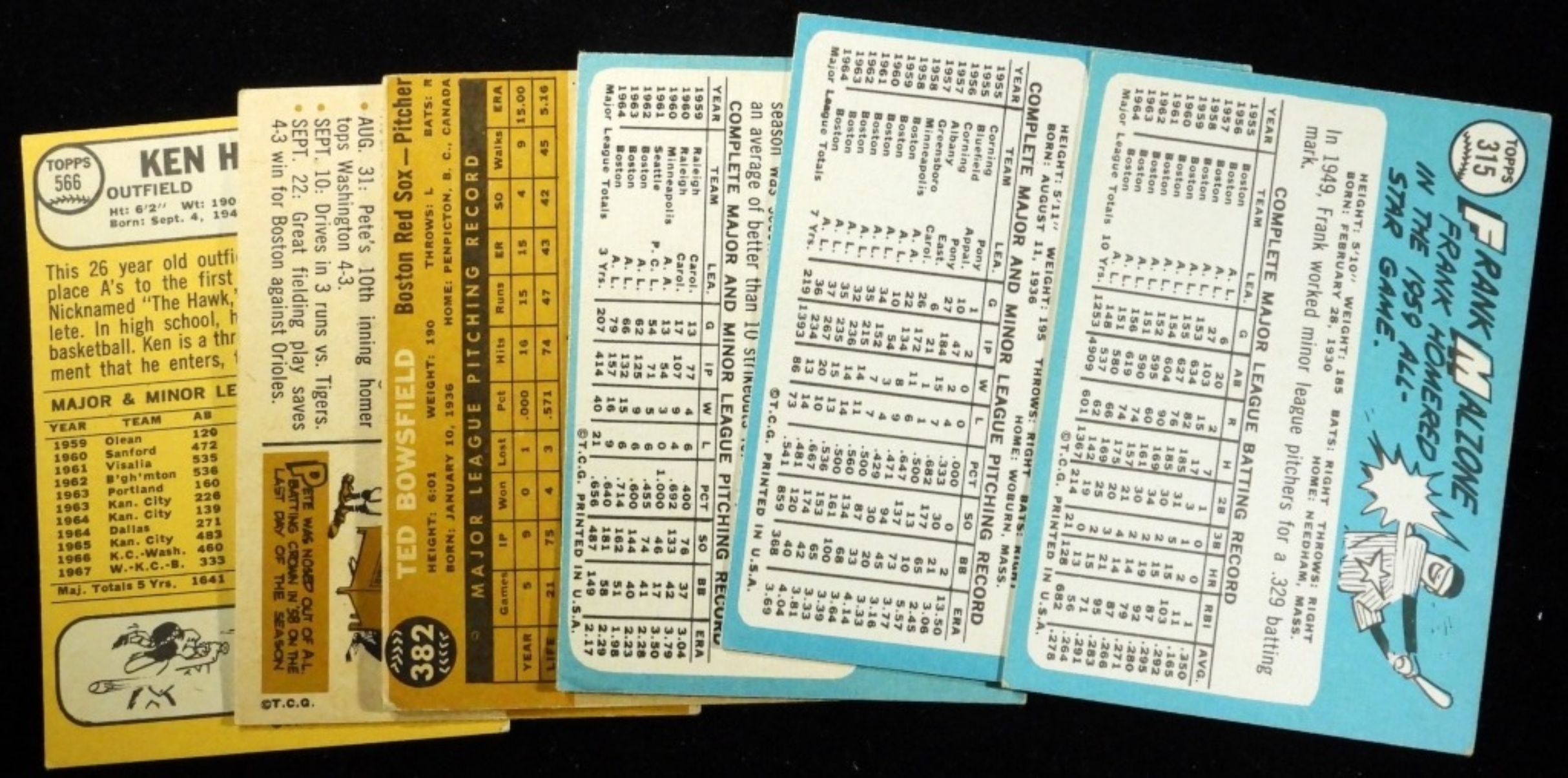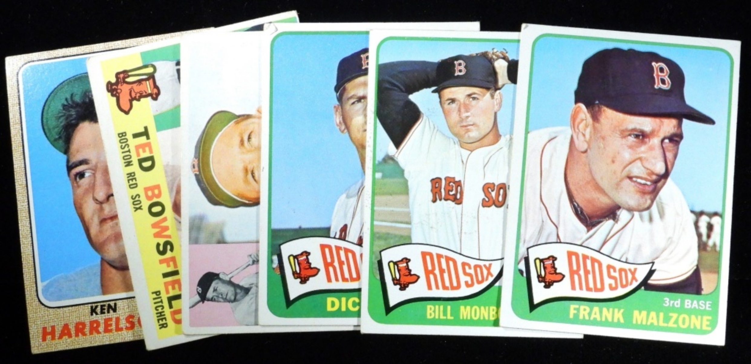 1) #295 Dick Radatz G. (There are bent corners.) 2) #142 Bill Monbouquette VG. 3) #315 Frank Malzone VG. 4) #15 Pete Runnels VG. 5) #82 Ted Bowsfield VG. 6) #566 Ken Harrelson VG