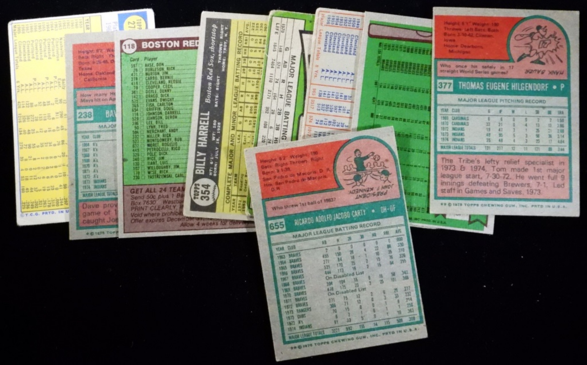 1) #118 Boston Red Sox VG. 2) #354 Billy Harrell VG. 3) #275 Vada Pinson Poor. 4) #195 Bobby Avila Poor. 5) #45 Boog Powell VG. 6) #377 Tom Hilgrendorf VG. 7) #655 Rico Carty VG. 8) #238 Dave Duncan VG. 9) #275 Duke Sims
