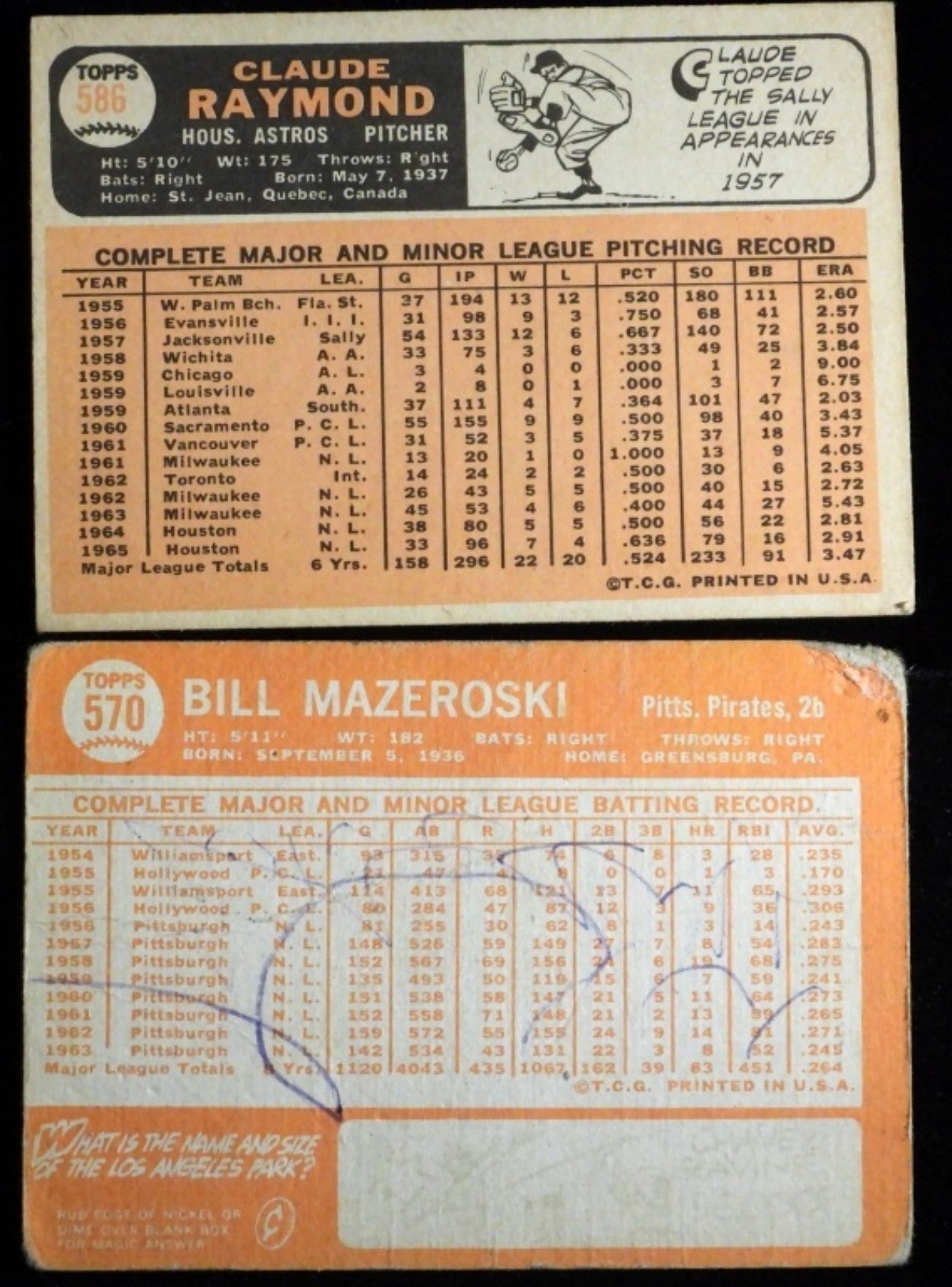 Mazeroski is creased and corners are rounded. Raymond has no creases, slightly rounded corners. Mazeroski is in fair condition. Raymond is in good condition