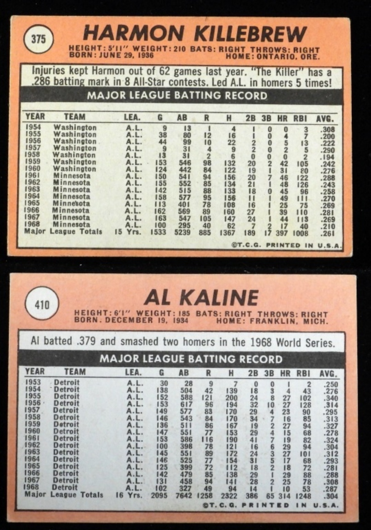 1) #375 Harmon Killebrew (slightly rounded corners) 2) #410 Al Kaline