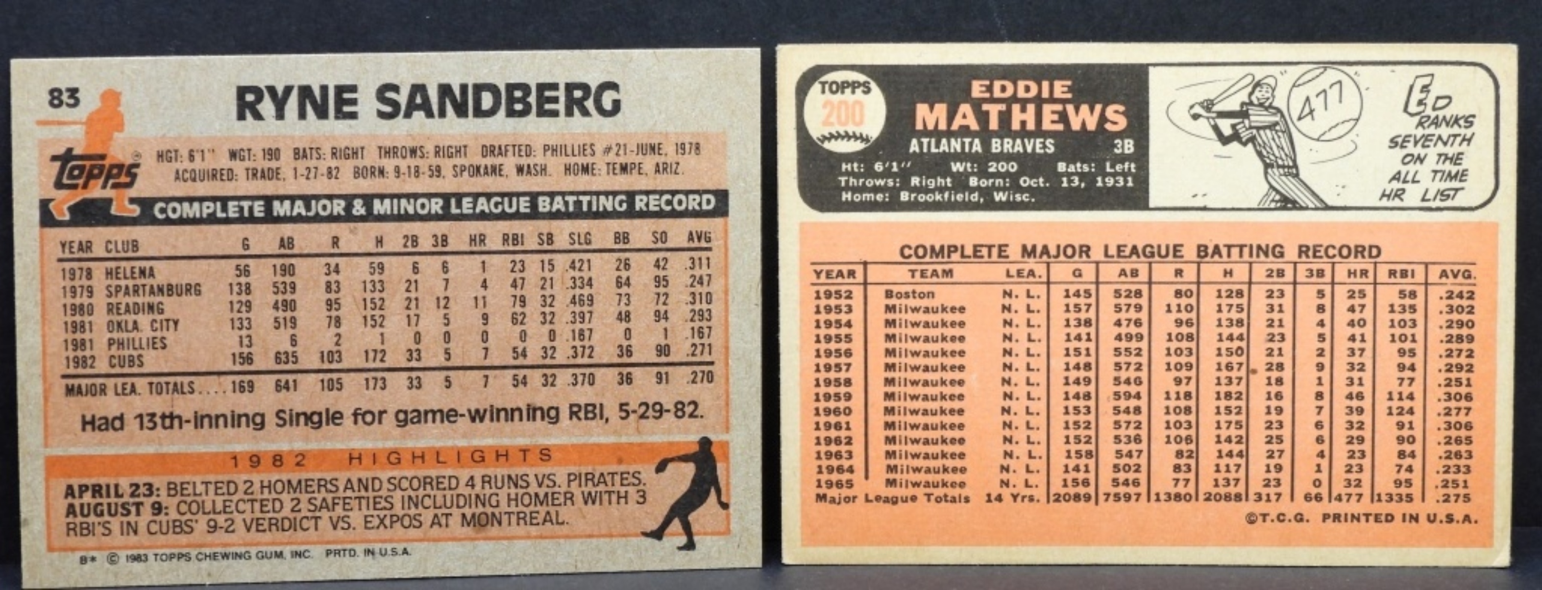 1) ED Mathews TOPPS #200 G-VG. 2) Ryne Sandberg TOPPS #83 VG