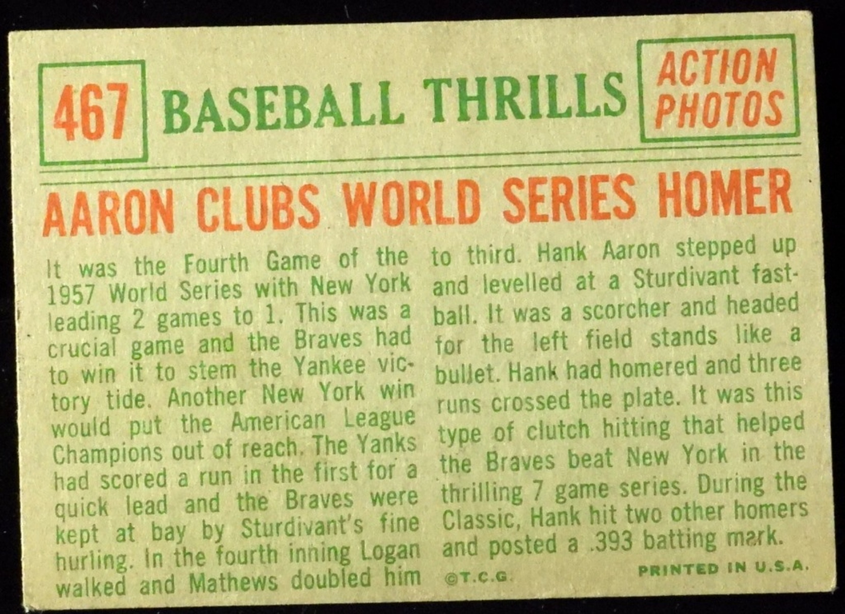 G/VG has rounded corners and is off-center. #467 Aaron Clubs World Series Homer