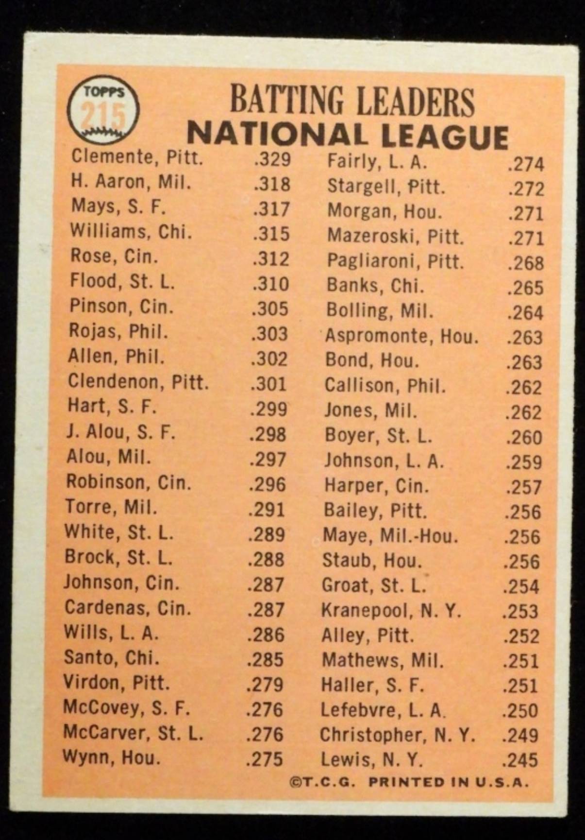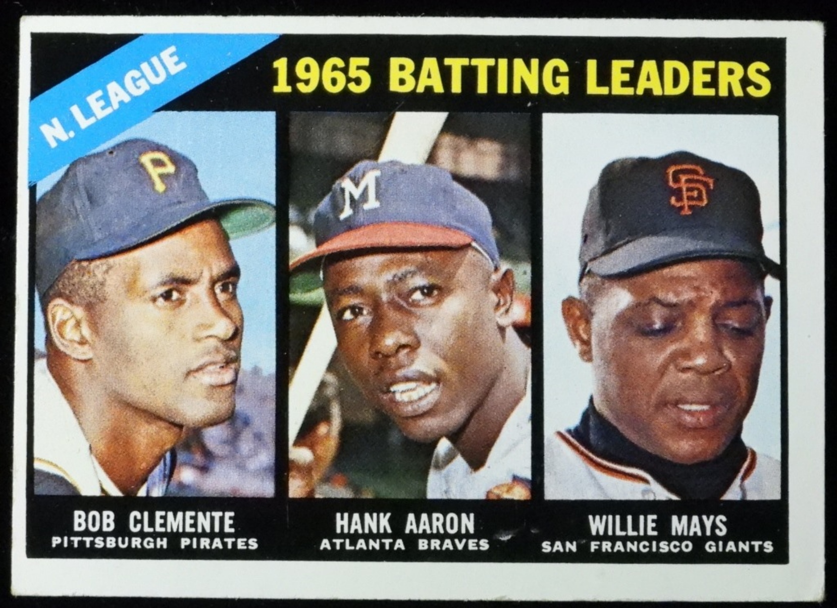 G/VG condition with rounded corners, scuffed edges, and color fading. National League Bob Clemente, Hank Aaron, Willie Mays