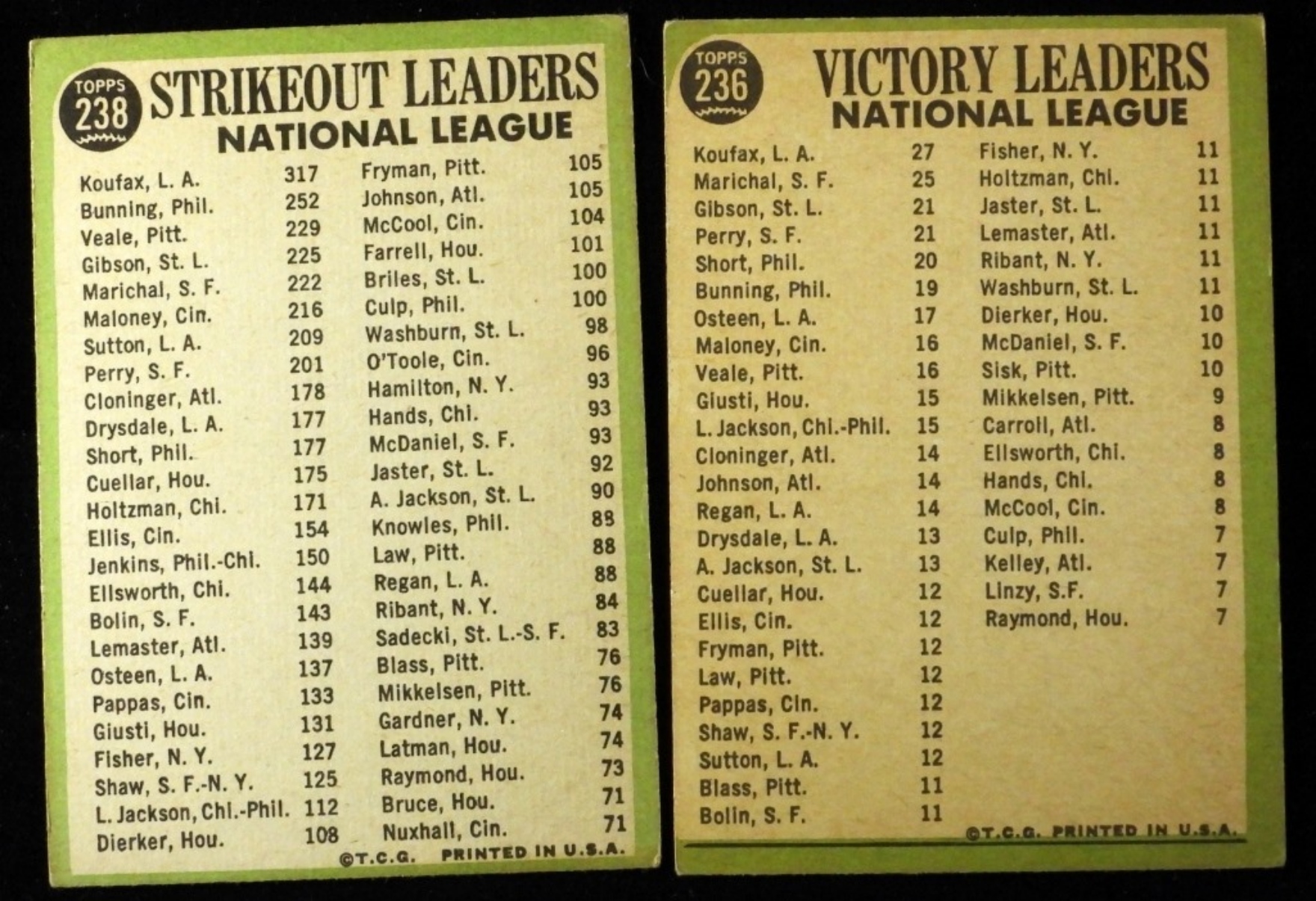Both are in good condition with creases and rounded corners, and color fading. #236 League 1966 Pitching Leaders (Sandy Koufax, Juan Marichal, Bob Gibson, Gaylord Perry), #238 N. League 1966 Strikeout Leaders (Sandy
