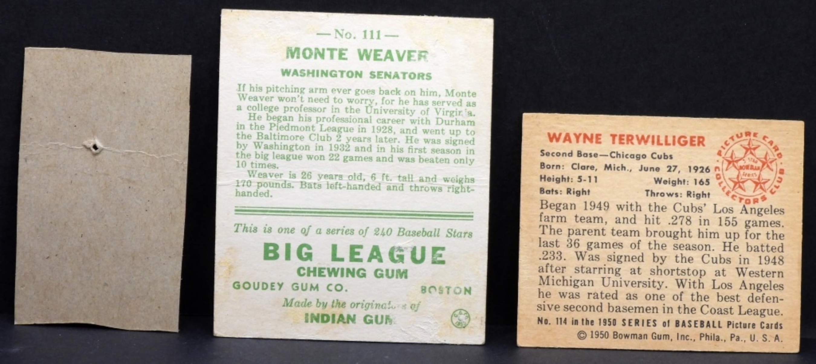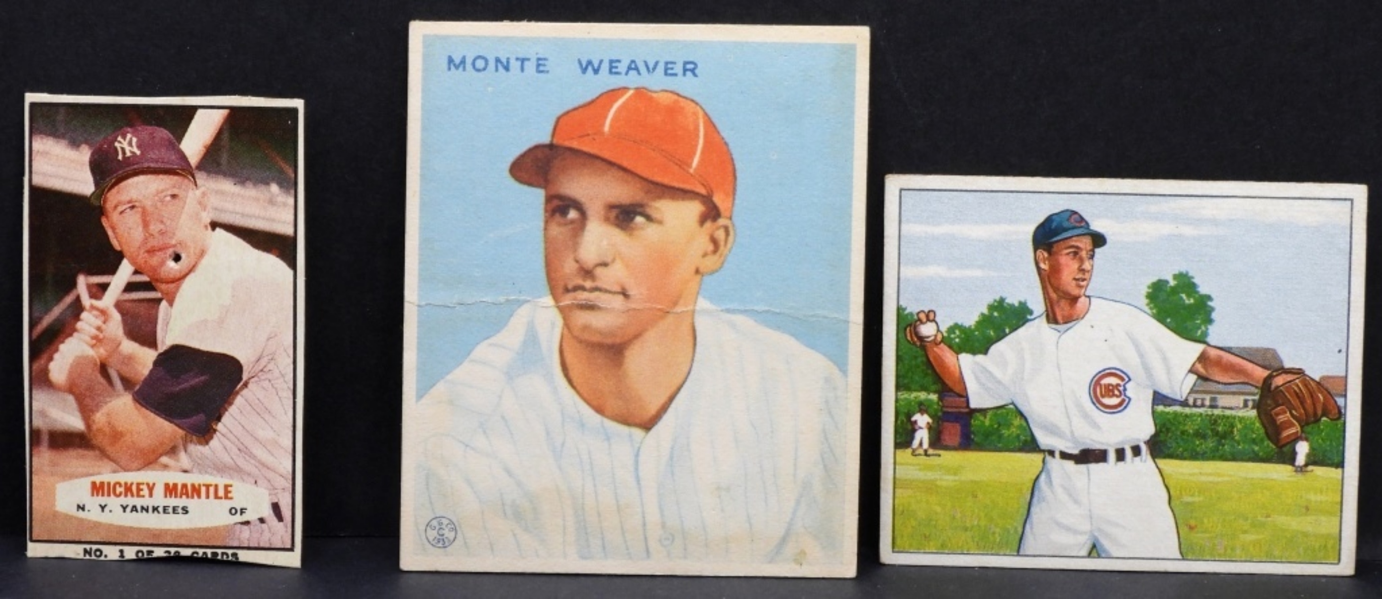 1) Mickey Mantle (Has a hole from being hung.) 2) Monte Weaver Indian Gum Card (Has a bend through the card.) 3) Wayne Terwilliger 1950 Bowmen Gum card.)