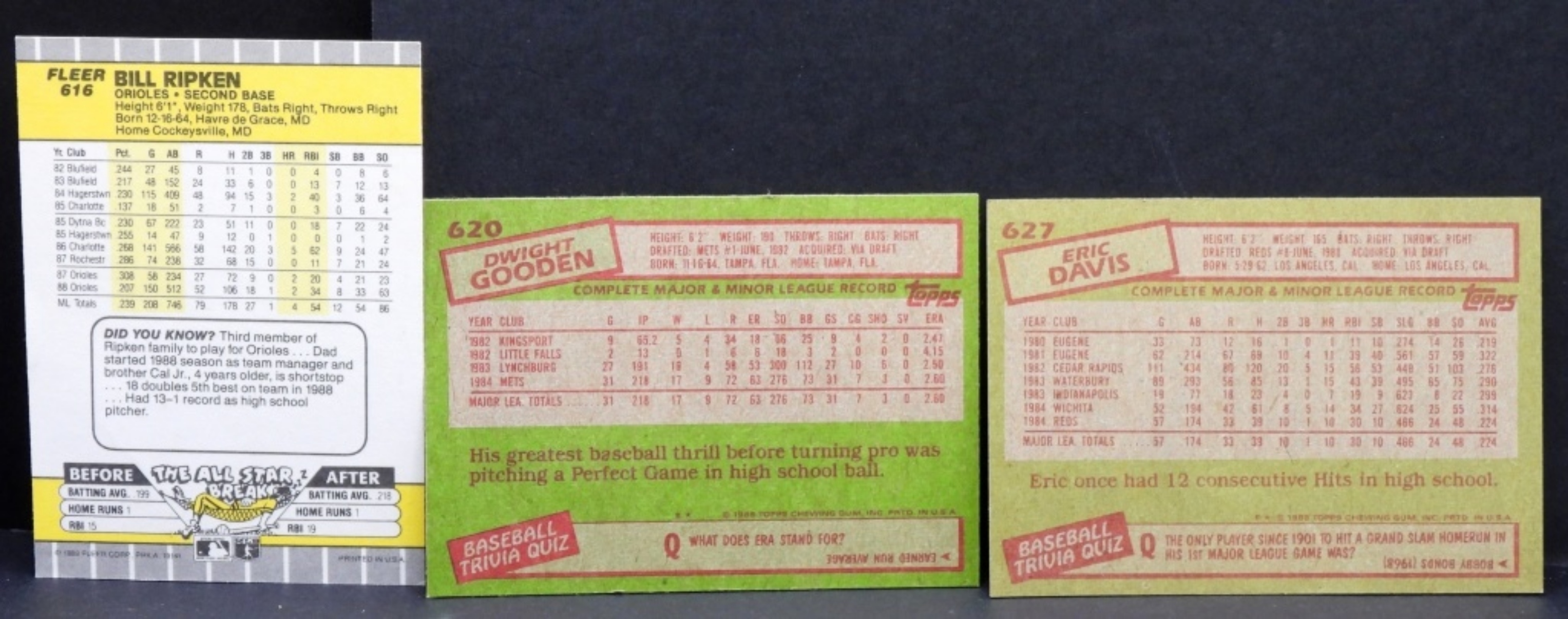 1) TOPPS #627 Eric Davis VG. 2) #620 Dwight Gooden VG. 3) #616 Bill Ripken VG