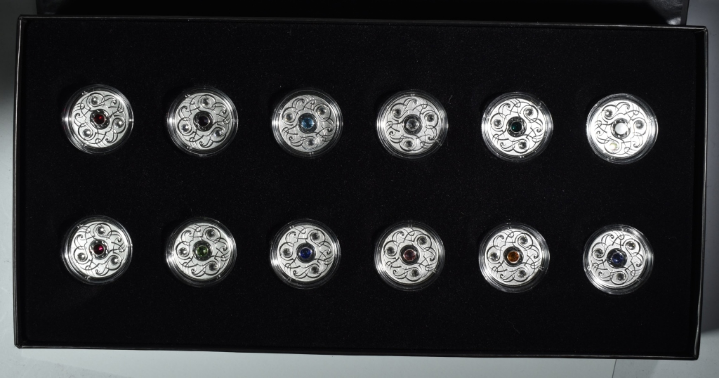 Includes 12 coins with stone for each month