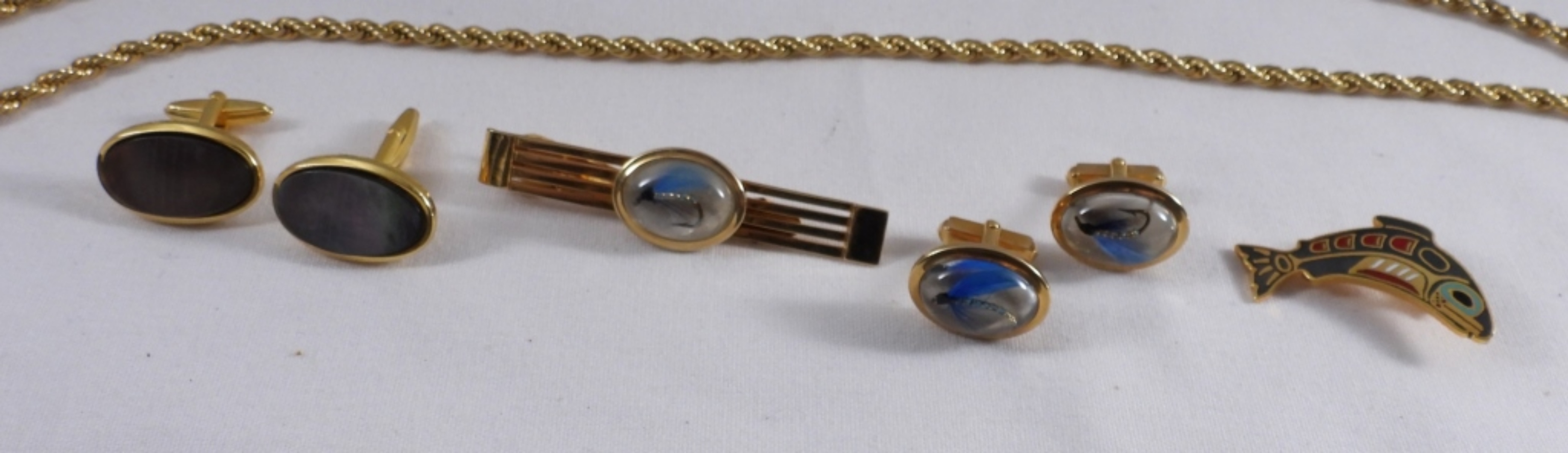 2 pairs of cuff links, a tie clip, a necklace, and a pin.