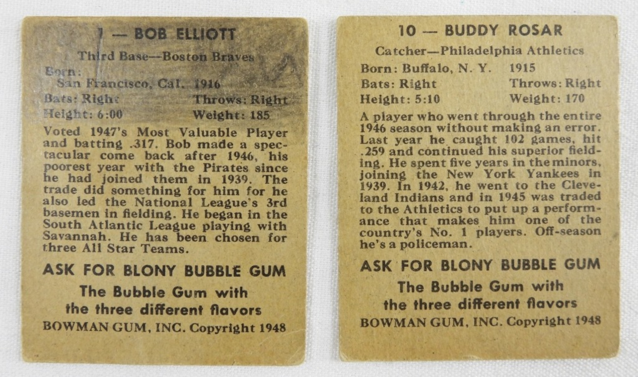 Bob Elliott & Buddy Rosar. Both in good condition, no creasing, rounded corners.
