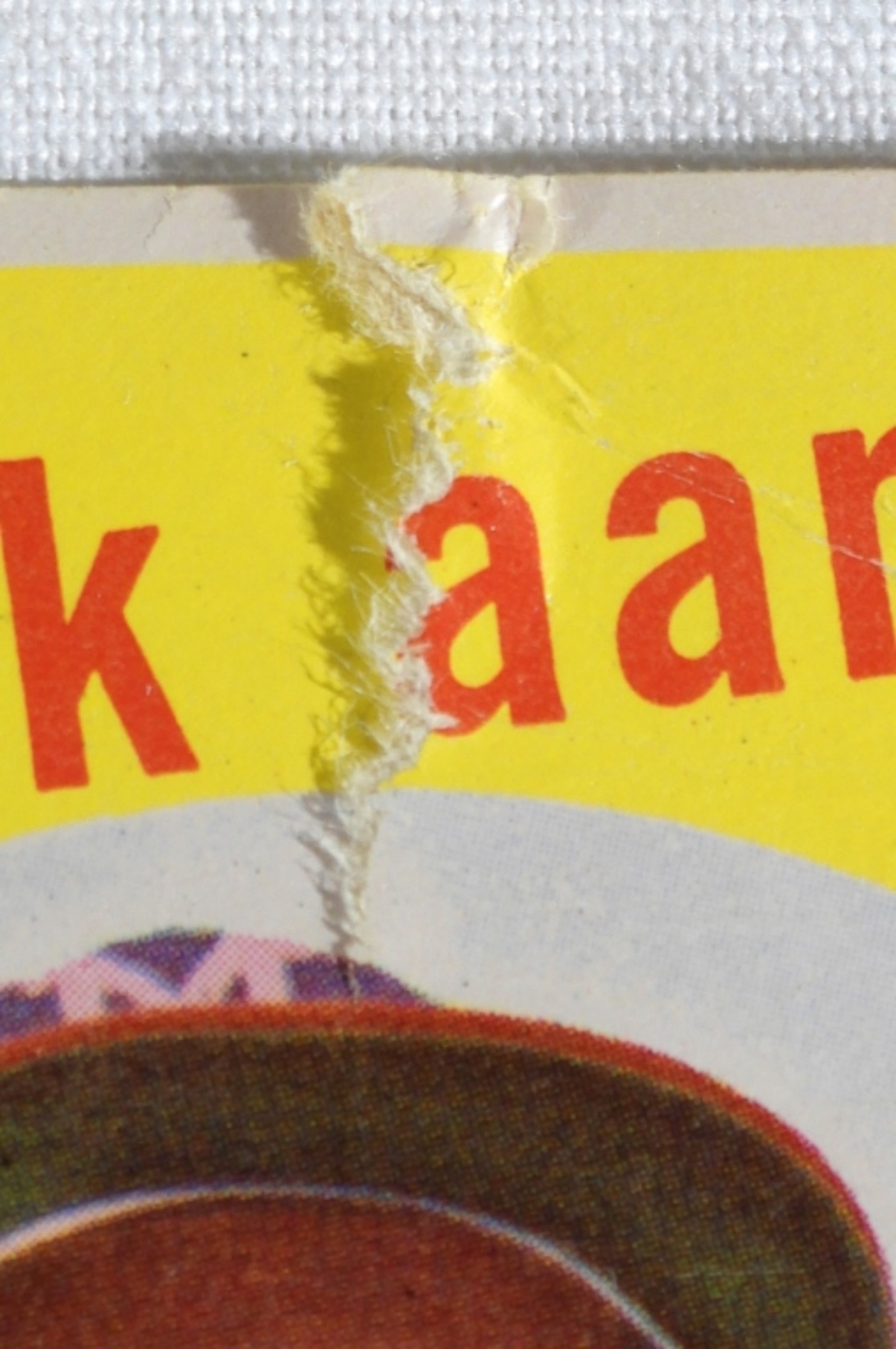 Ripped at the top, corners are rounded. Crease at the bottom. In poor condition