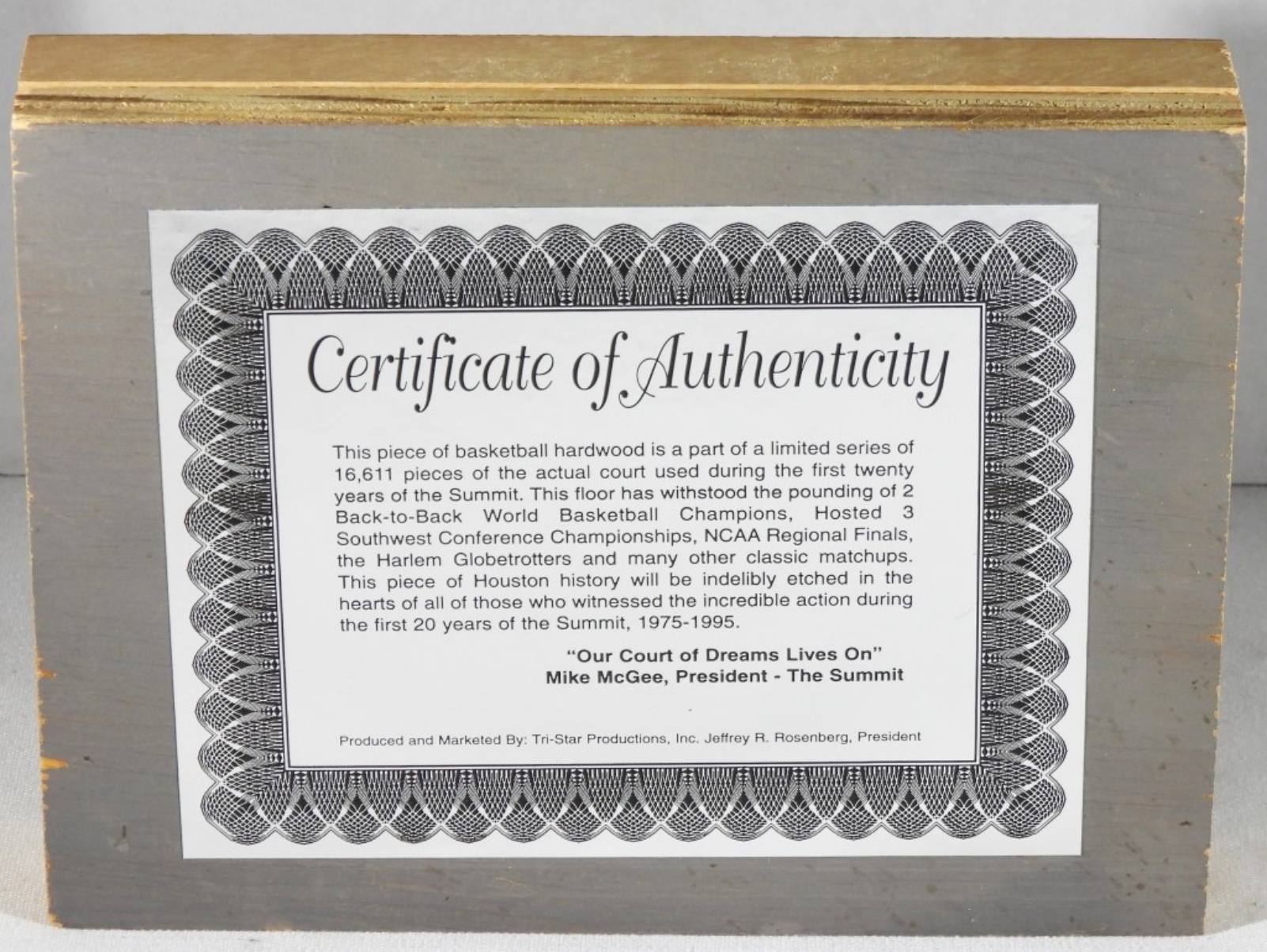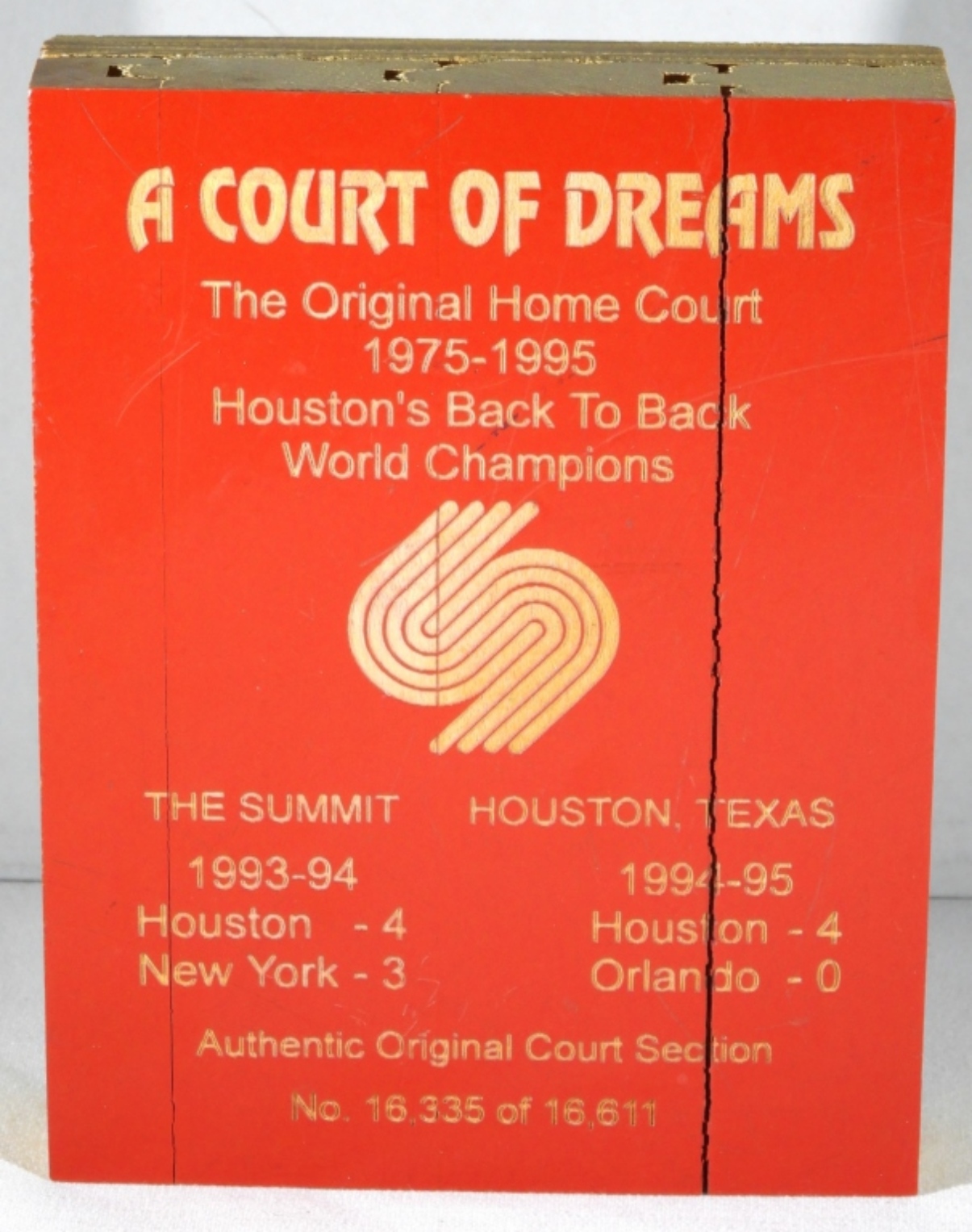 A piece of hardwood floor for the Houston Rockets back-to-back world championships 1975-1995.