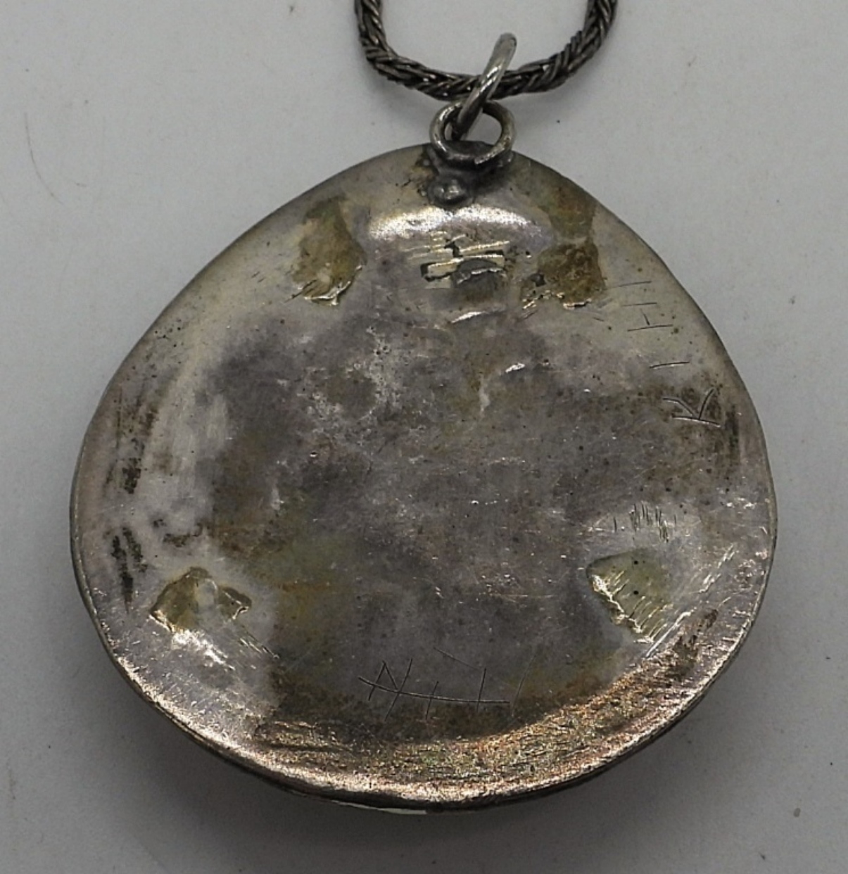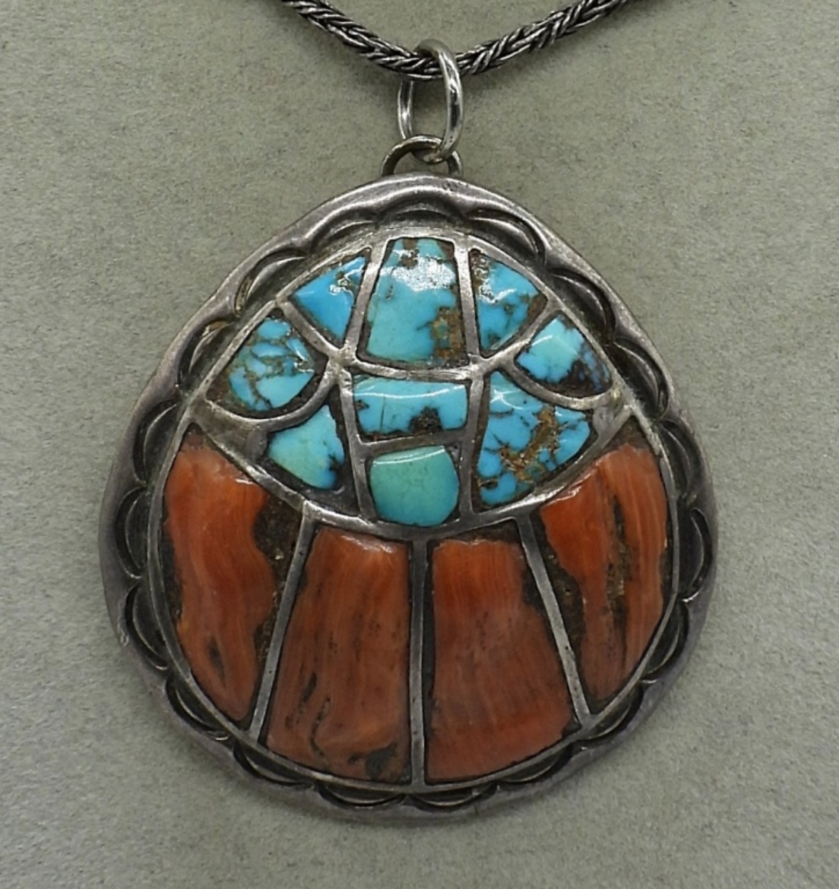 Native American turquoise and coral sterling pendant, 2″ long. Sterling 24″ chain. (23.4 dwt)