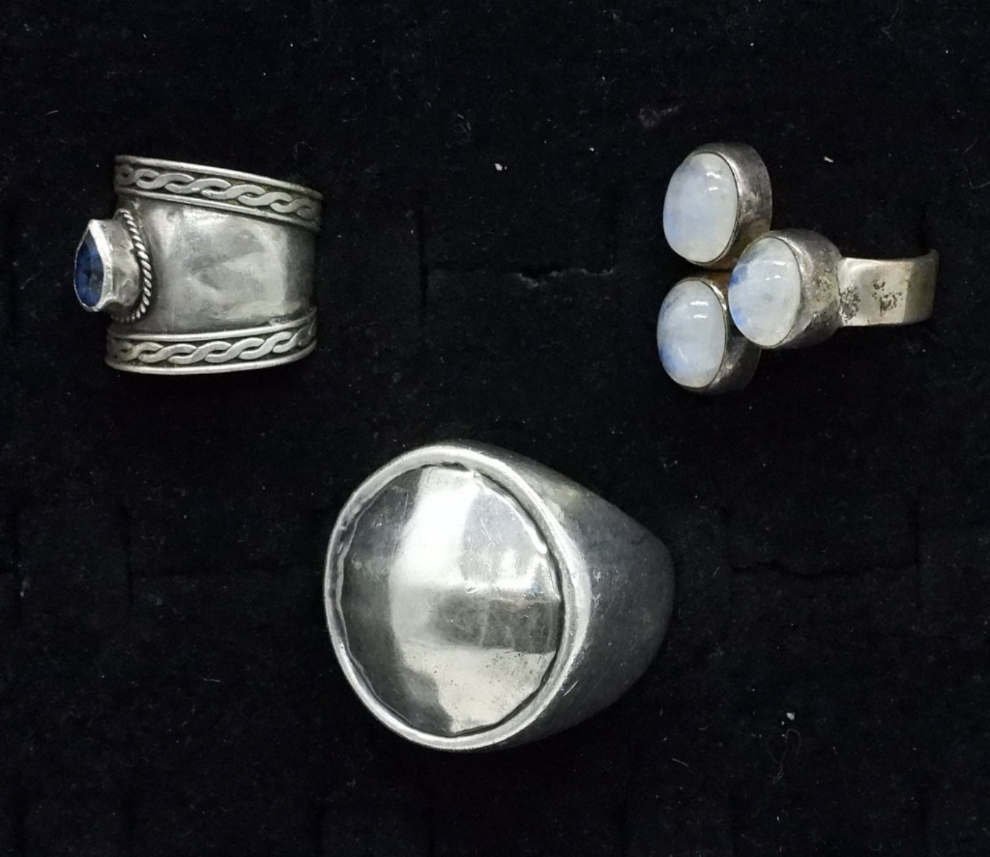 Two sterling fashion rings, with gemstones, sizes 7 & 8. Chunky ring is marked 999 Mexico and is size 8. (21.9 dwt)