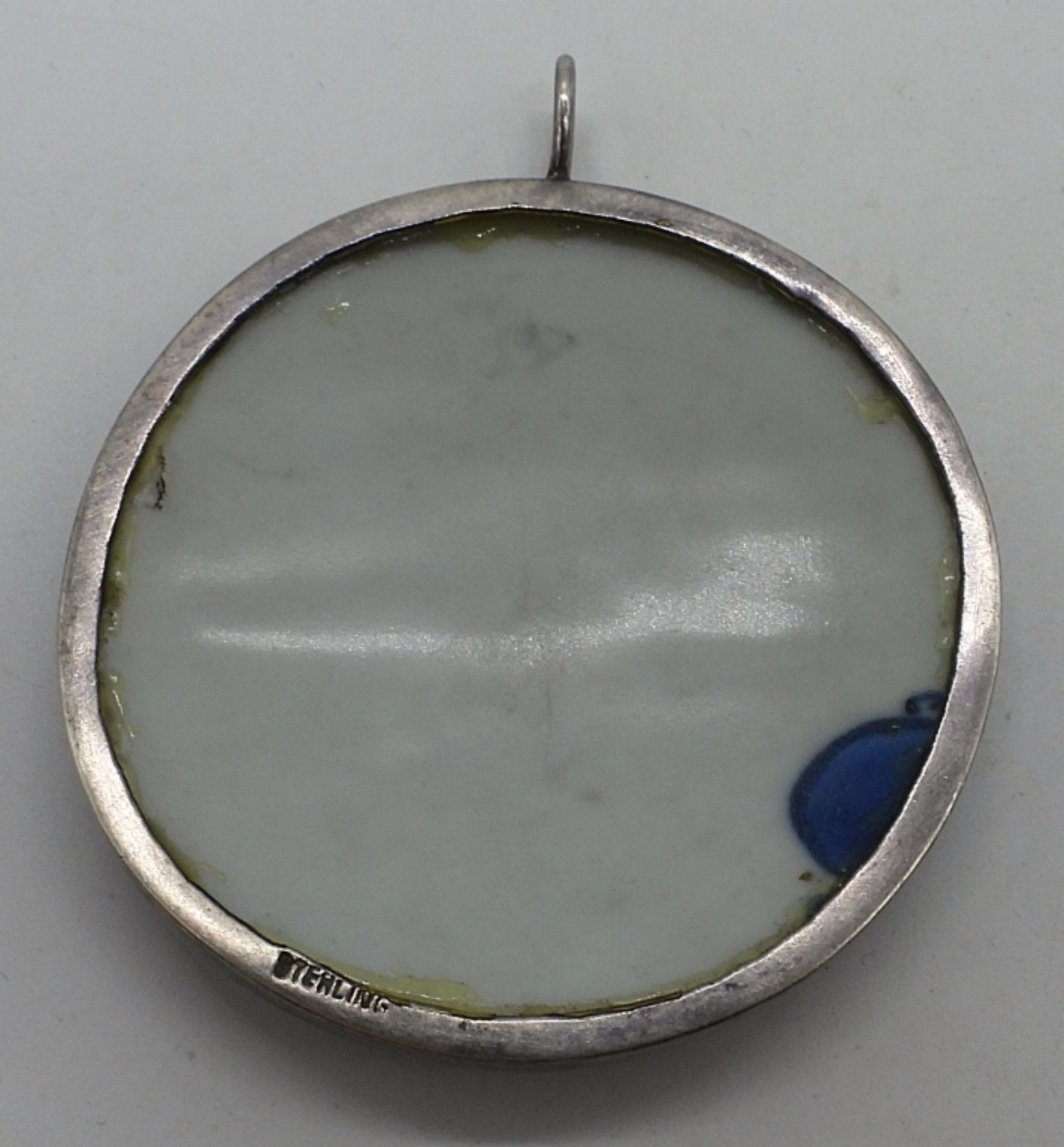 Large blue and white porcelain pendant in sterling, 3″. Only marked “Sterling”. (8 dwt)