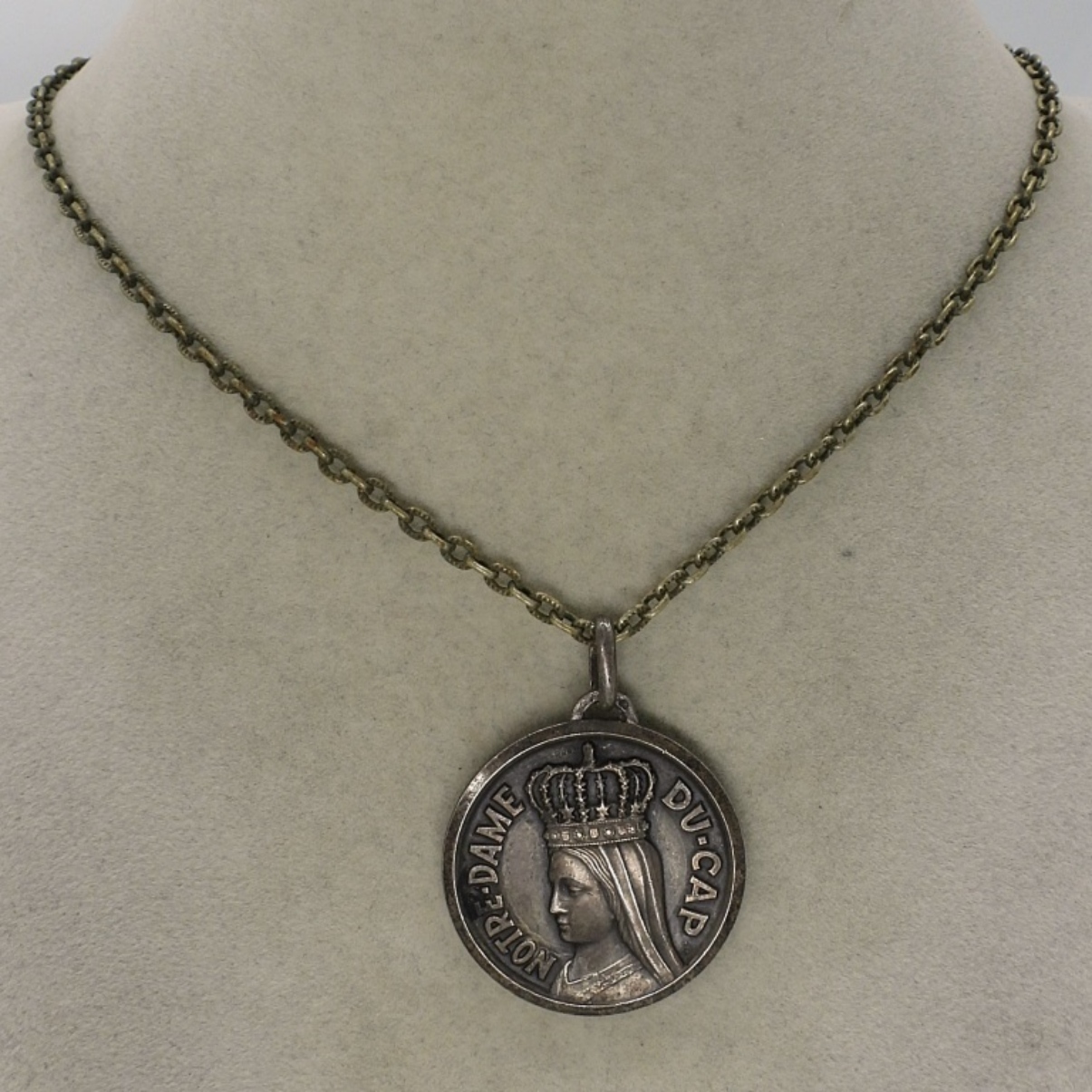 Notre Dame Du Cap sterling pendant, 1.5″ long. On a sterling 22″ chain. (13 dwt)