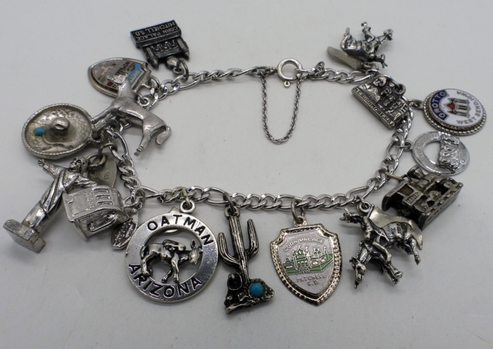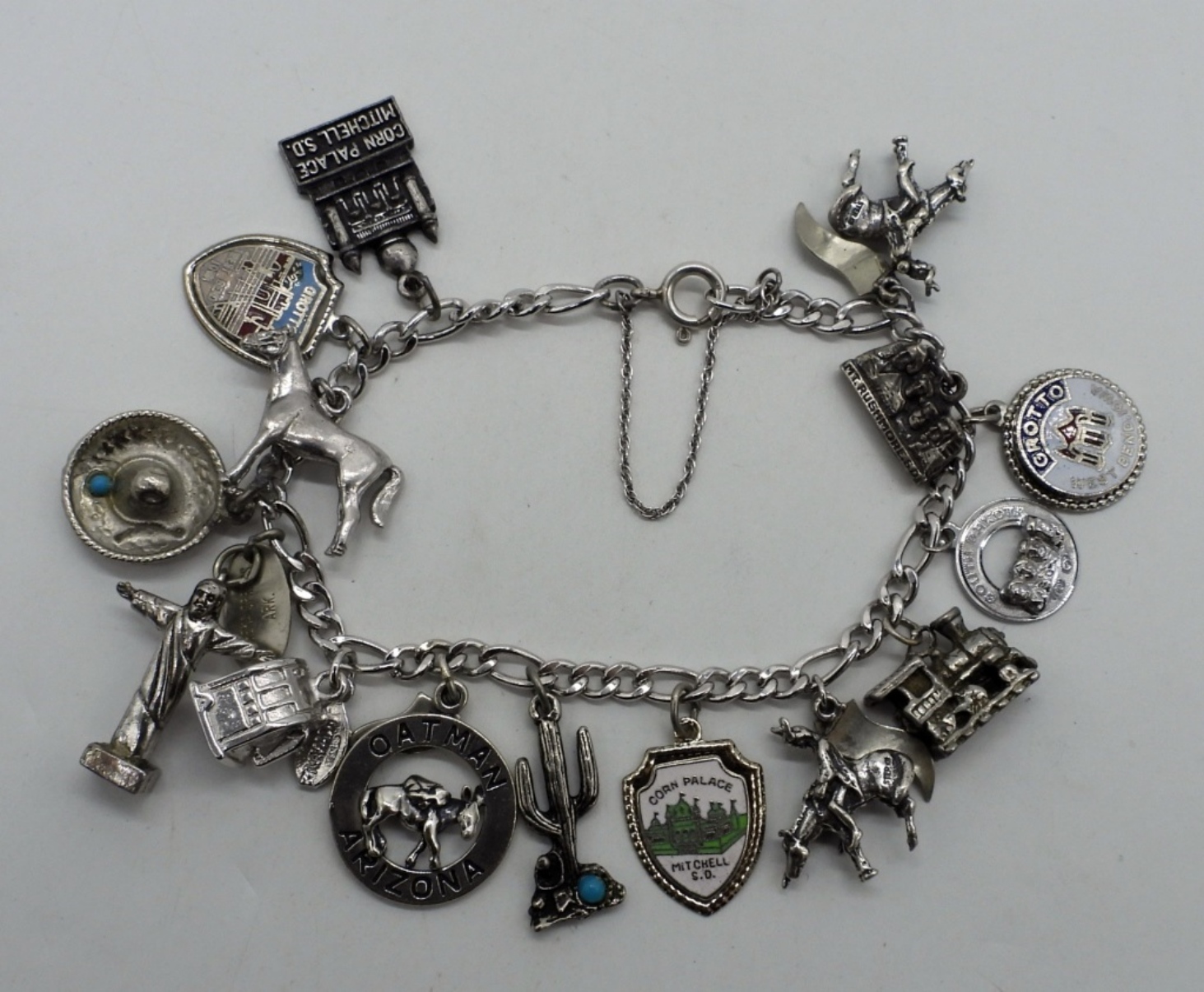 Vintage sterling charm bracelet, 8″ long with 15 charms. (34 dwt)