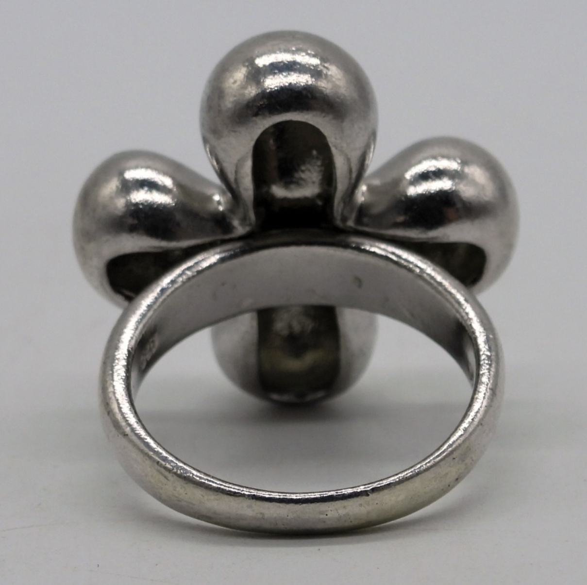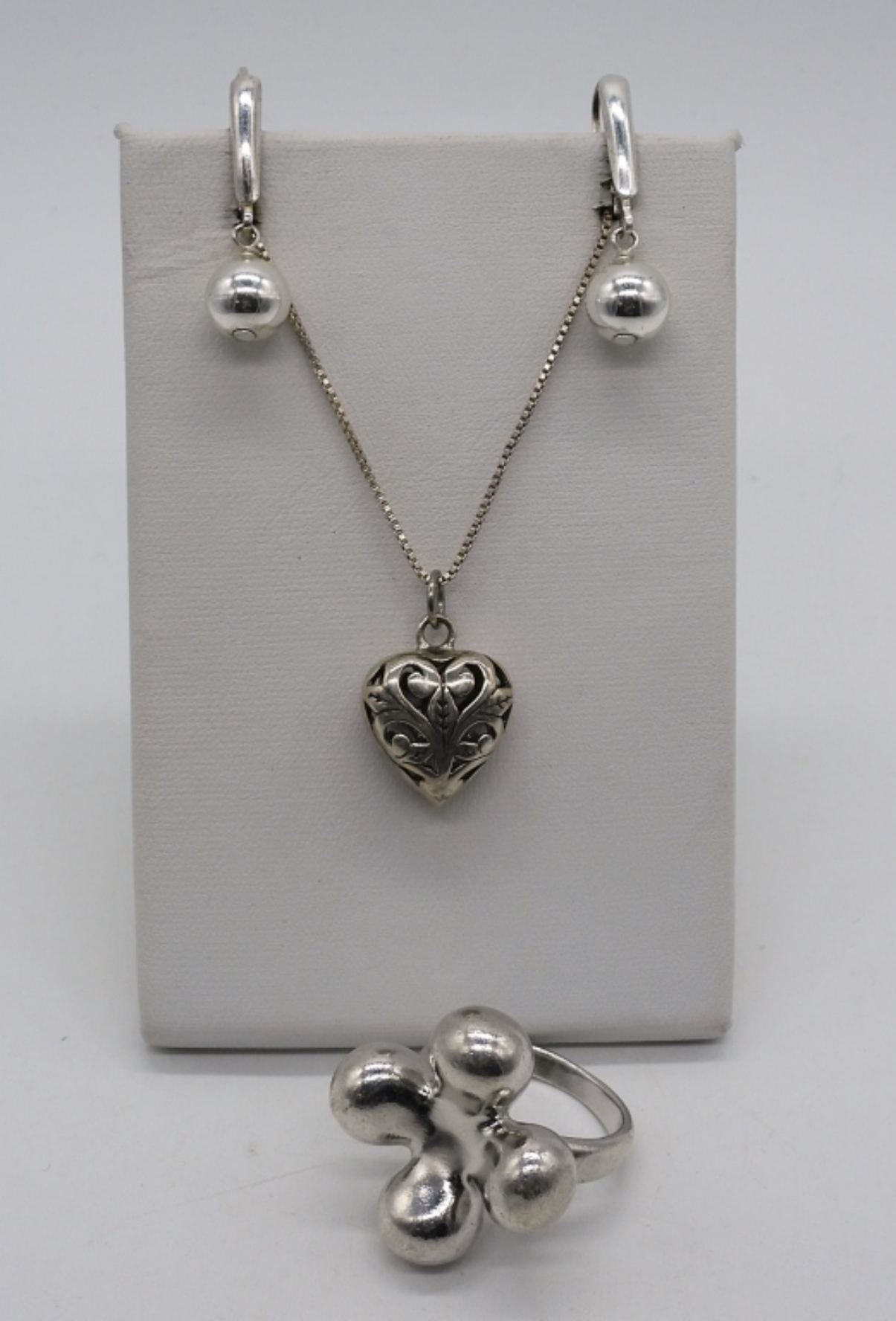 Simple sterling designs. Necklace is 16″ long. Pierced earrings hang 1″ long and ring is size 7.5 (13.8 dwt)