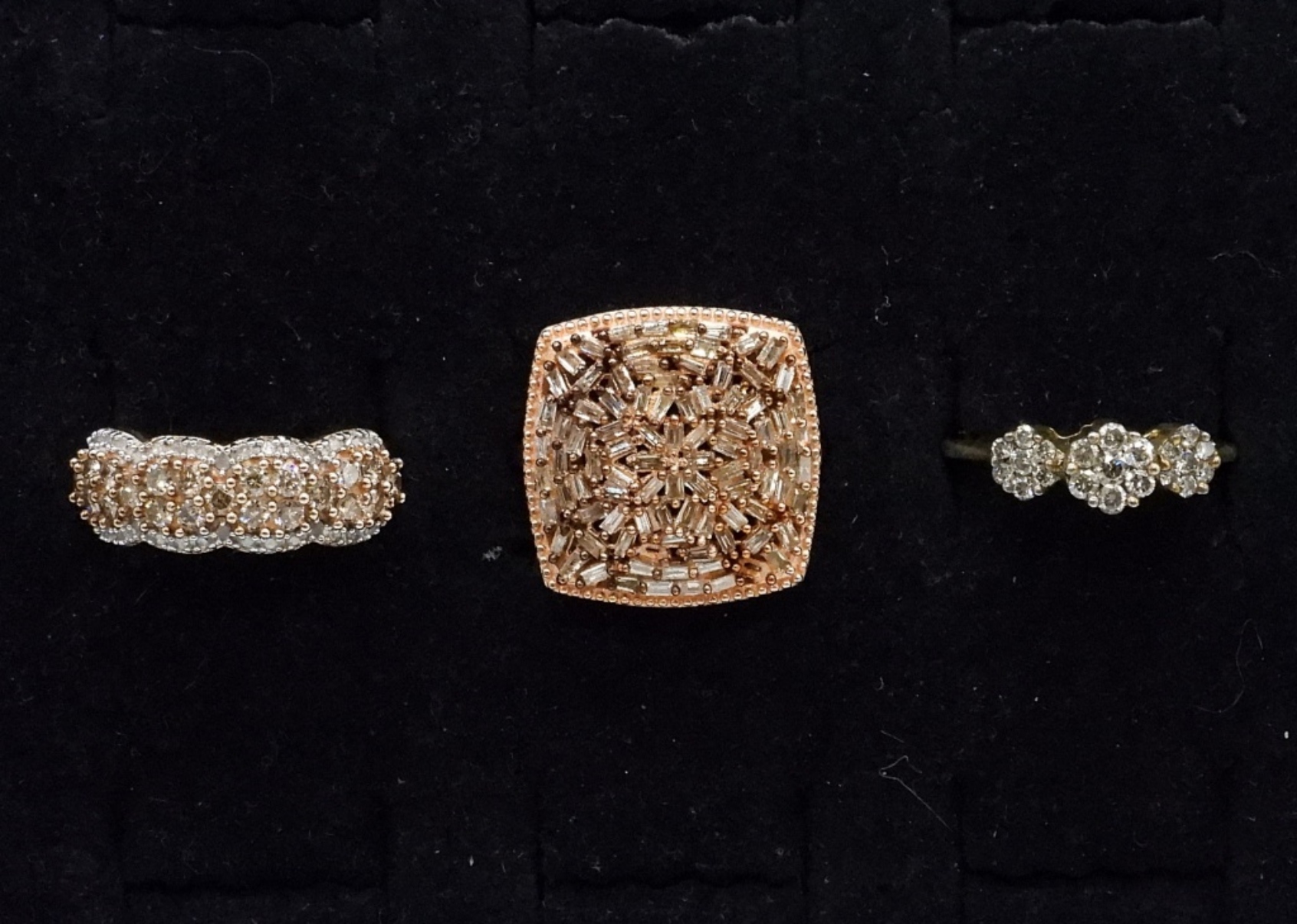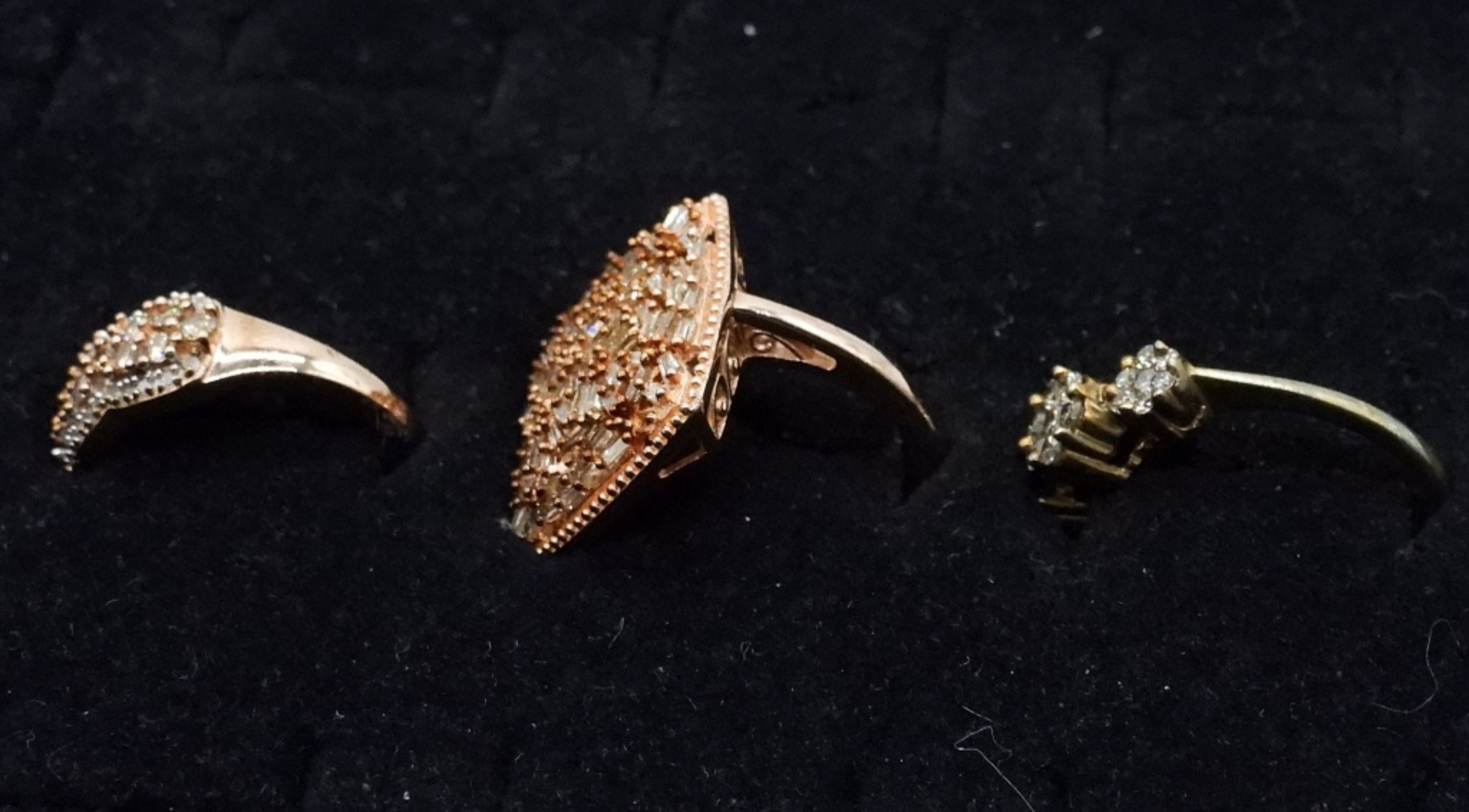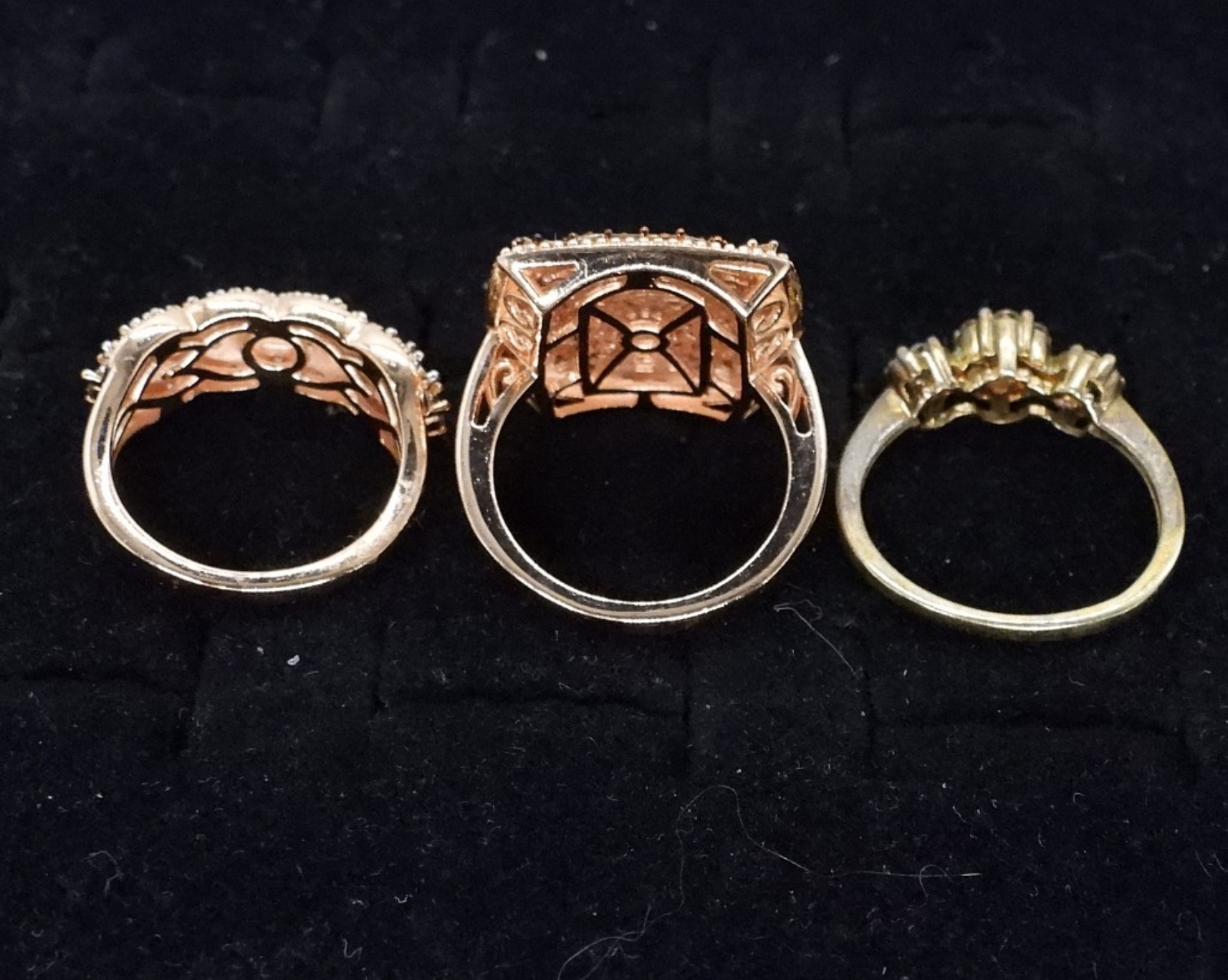 Three gorgeous sterling, gold toned rings. All with diamonds (tested). No carat weight available. Ring sizes are 7 & 8. (7.7 dwt)