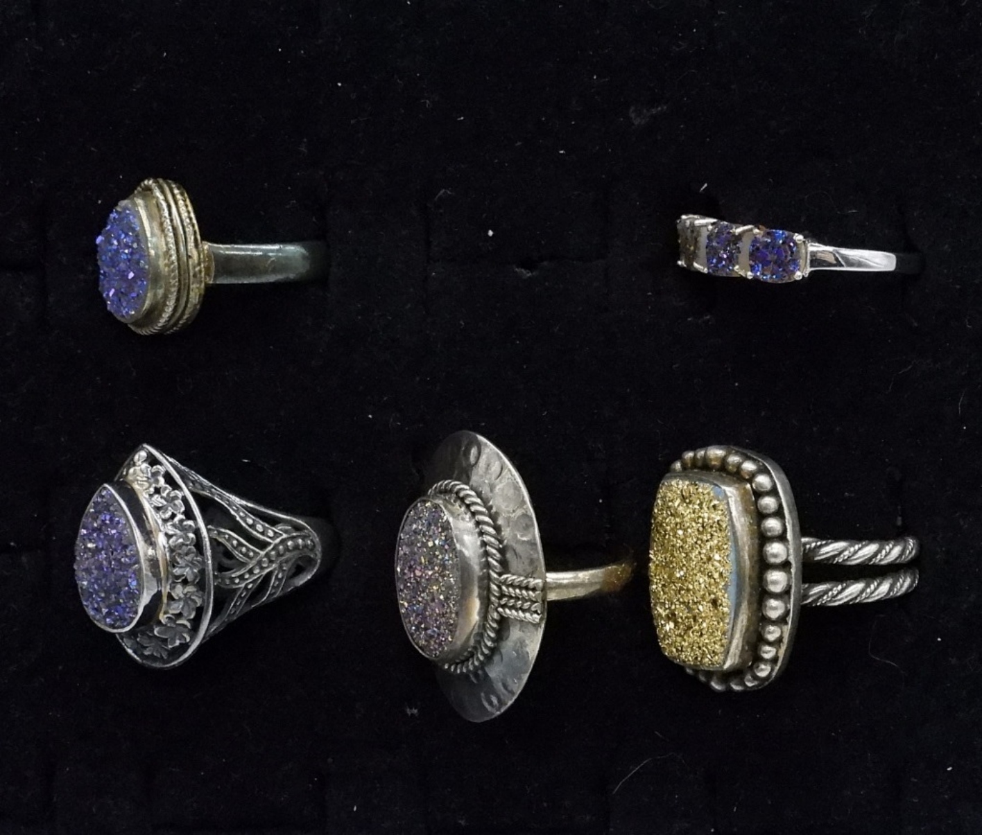 Five sterling, colored druzy fashion rings. Size 5.5 – 7. (20 dwt)