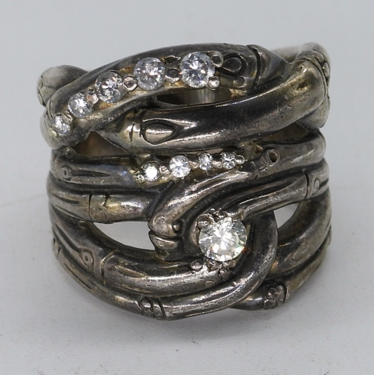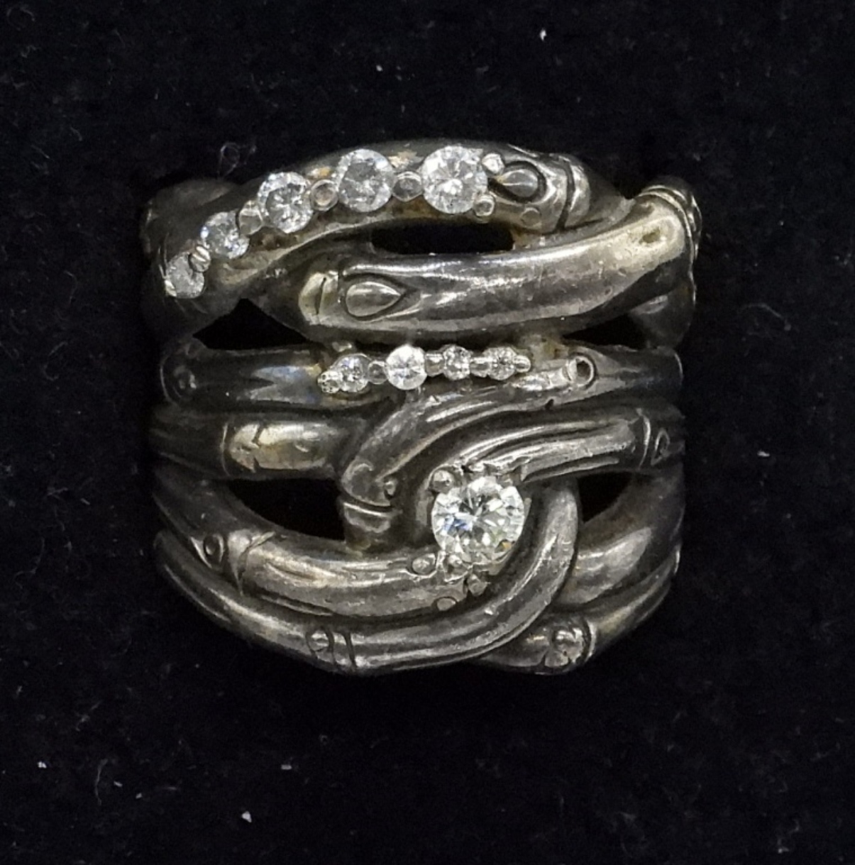 Sterling diamond ring (diamonds have been tested), size 6. Sterling is shaped like Bamboo. Largest diamond is approximately 1/4 carat. Other diamonds have not been sized. Total carat weight unknown. (8.5 dwt)